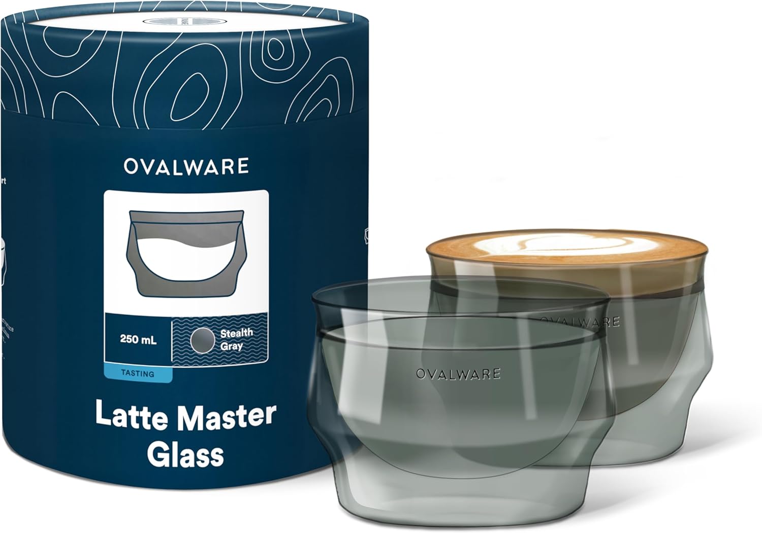 ovalware 8.5oz Double Wall Latte Cups, Latte Set of 2 - Latte Glasses for Cold & Hot Drink, Palm-Sized Cups with Wide Rim for Artistic Designs - Stealth Gray