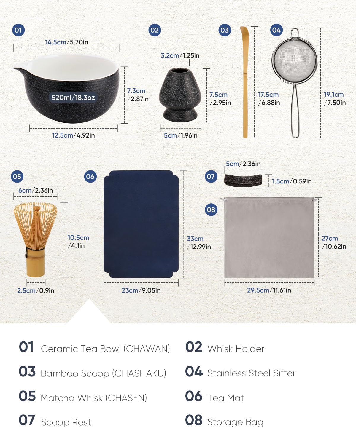 - [Exquisite Matcha Set Gift] All packaged in a beautiful gift box. You will get a complete 7-PC matcha kit set: a ceramic tea bowl (CHAWAN), matcha whisk (CHASEN), whisk holder, bamboo scoop (CHASHAKU), scoop rest, stainless steel sifter and tea mat. This gift will ensure a totally immersive experience of traditional Japanese tea ceremony for anyone who enjoys the ever-changing tea art (NOTE: This bowl and whisk set includes no green tea powder)