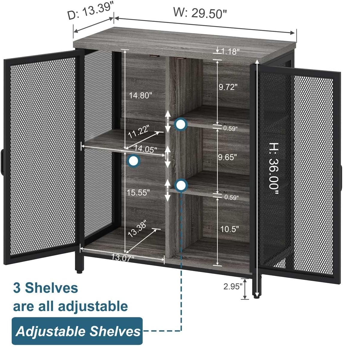 - Dimensions and Material: 29.53"W x 13.39"D x 36.00"H. Crafted from high-quality MDF board with rustic oak wood grain finished that adds farmhouse touch to your home. We also use powder coating to seal up the steel and the metal of this storage cabinet won’t rust over time.