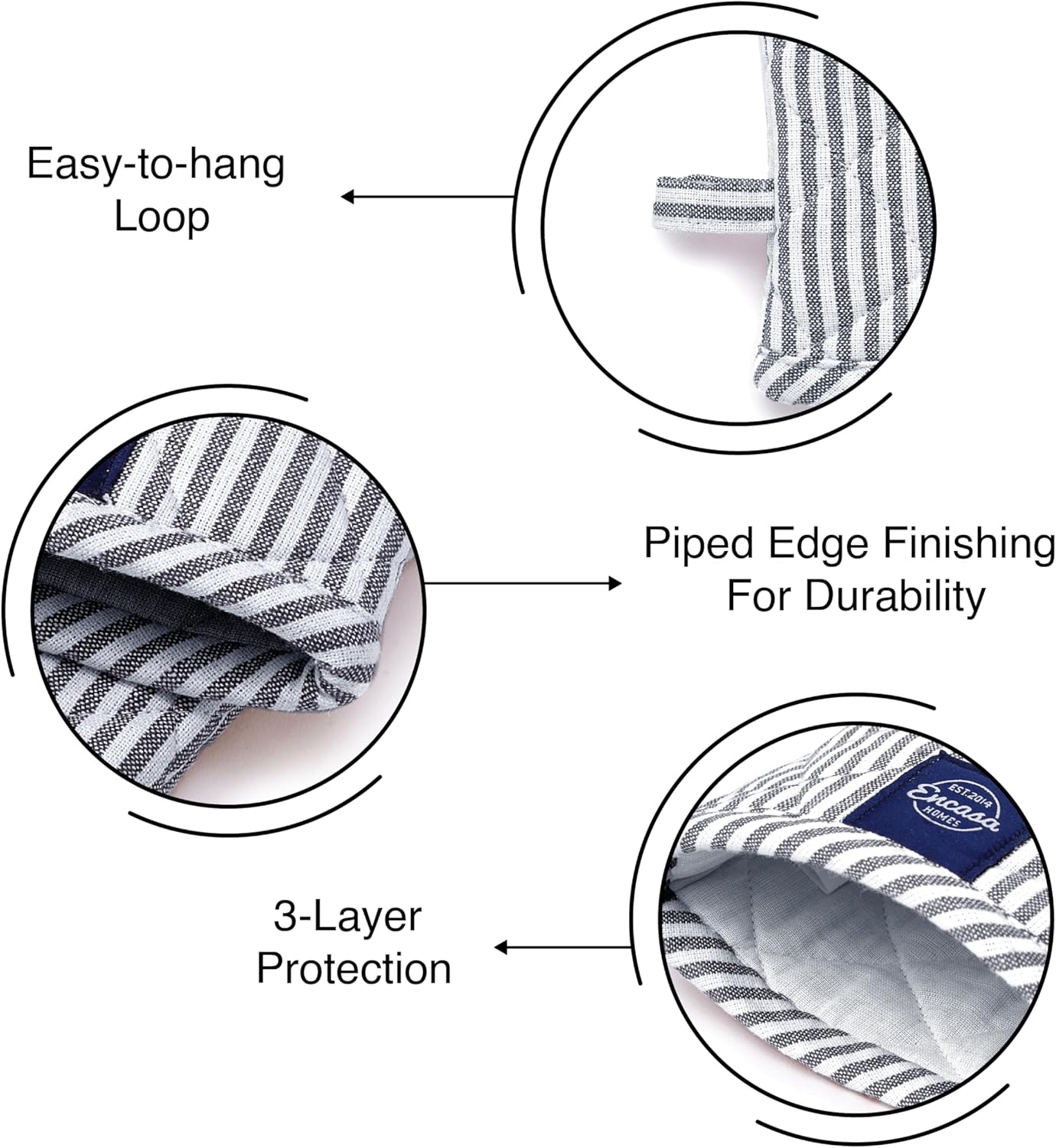 Encasa Homes Long 12"x7" Oven Microwave Hand Gloves Mitts (2 pc Set) for Kitchen Cooking & Baking - Heat Resistant, Thick & Safe, Protection of Hands from Hot Utensils - Ticking Navy Blue