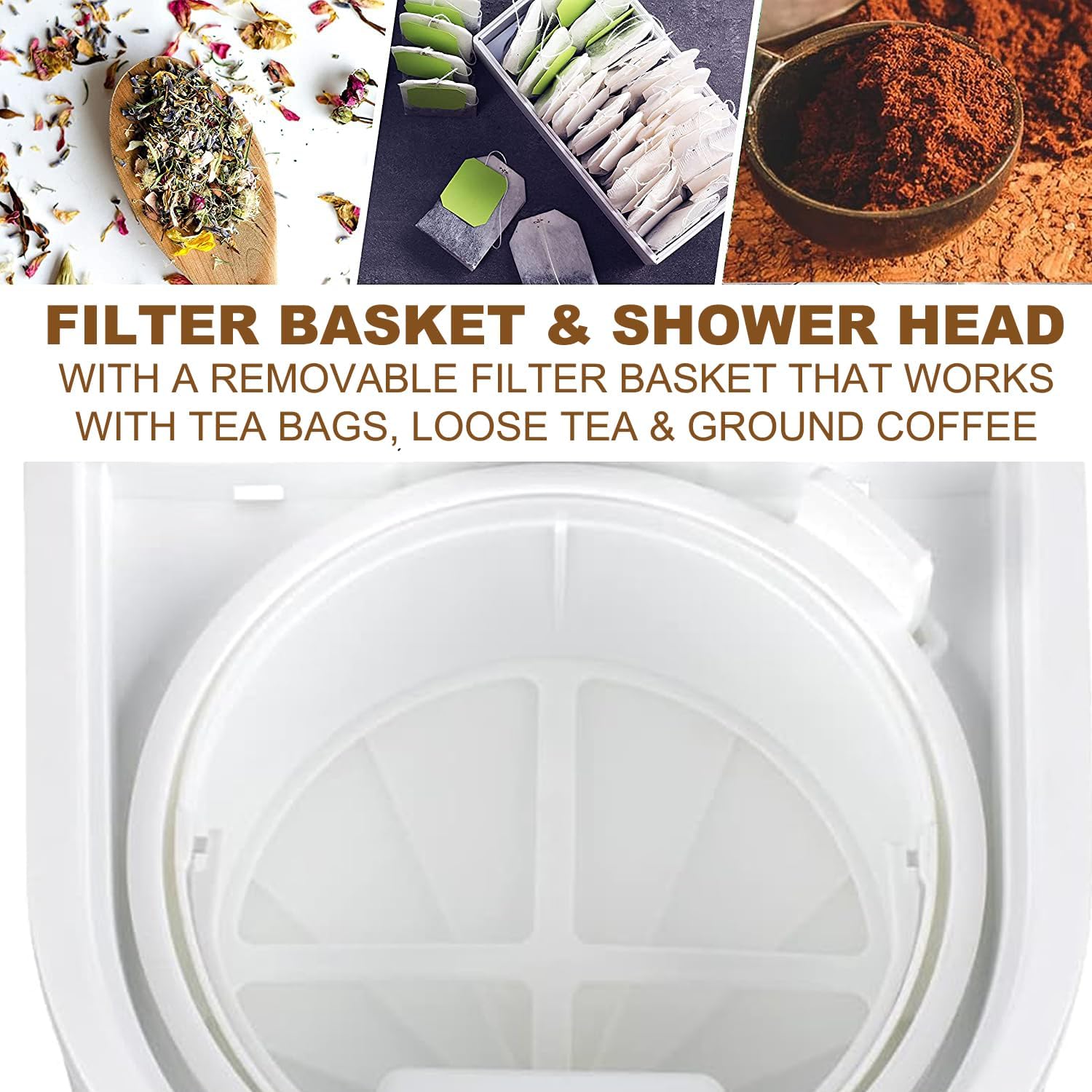 - Filter Basket & Shower Head: The removable filter basket works with fresh ground coffee, tea bags and loose leaf teas, while the shower head is designed for complete saturation and optimal flavor extraction