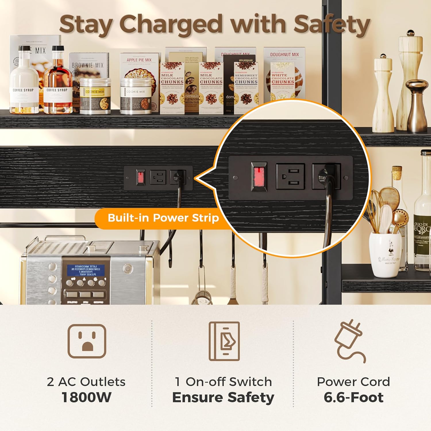 - [Where a Power Strip is Needed]: Bakers rack! Creative and considerate design, 2 AC outlets and 1 air switch, microwave, coffee or bread maker... all can be charged on it. No more tangled wires annoy you. Your tidy and well-organized kitchen will come back. Patent pending