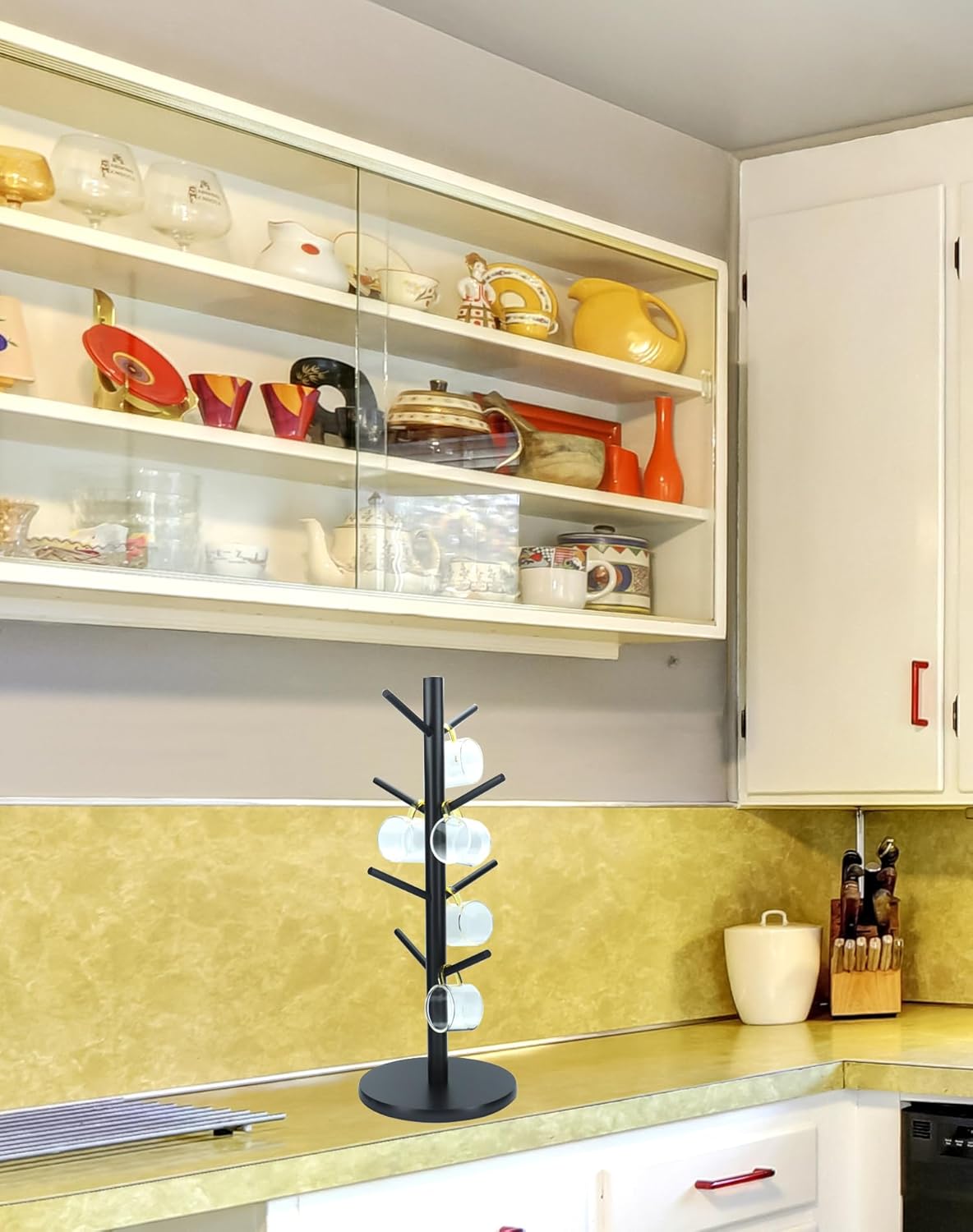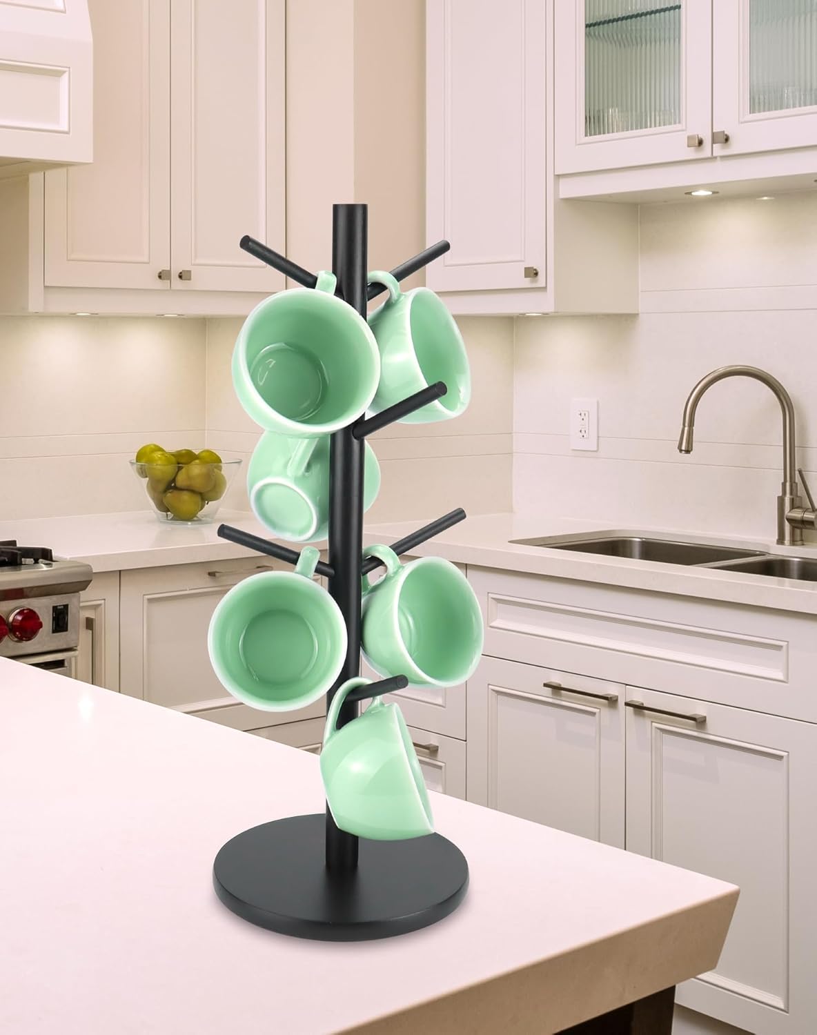 - Versatile Design: This elegantly crafted black wooden mug holder tree features 8 sturdy hooks, used for holding a variety of mug shapes and sizes, including square, circular, large, and extra-large mugs.