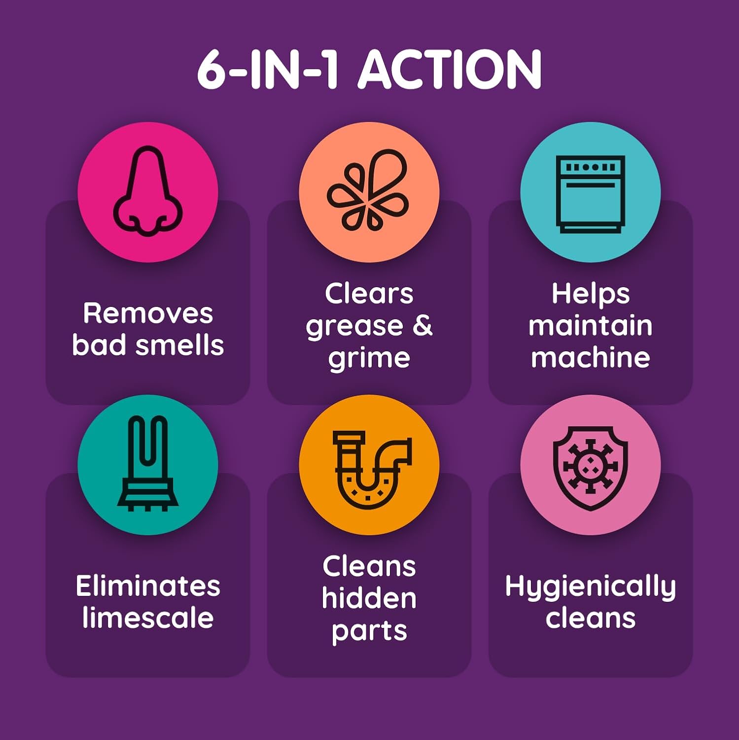 - Powerful Dish Washer Cleaning: Vamoosh dish washer cleaner keeps your dishwasher at its best. The powerful 6 in 1 formula cuts through grease and grime and hygienically cleans the dishwasher machinery, ensuring sparkling dishes with every cycle.