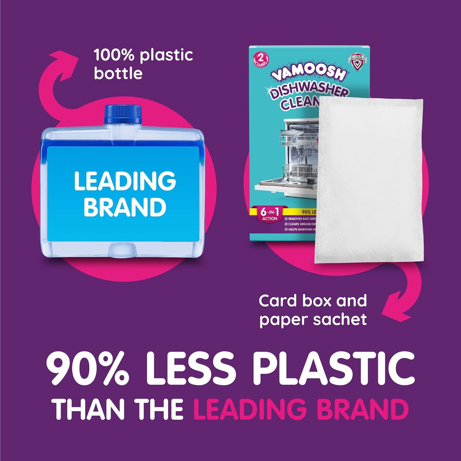 - Reduced Plastic Use: Because we have forgone the typical plastic bottle style of dishwasher cleaner, Vamoosh uses 90% less plastic than competing products. Instead, our formula comes in unique permeable sachets to deliver quality household cleaning without harming the environment.