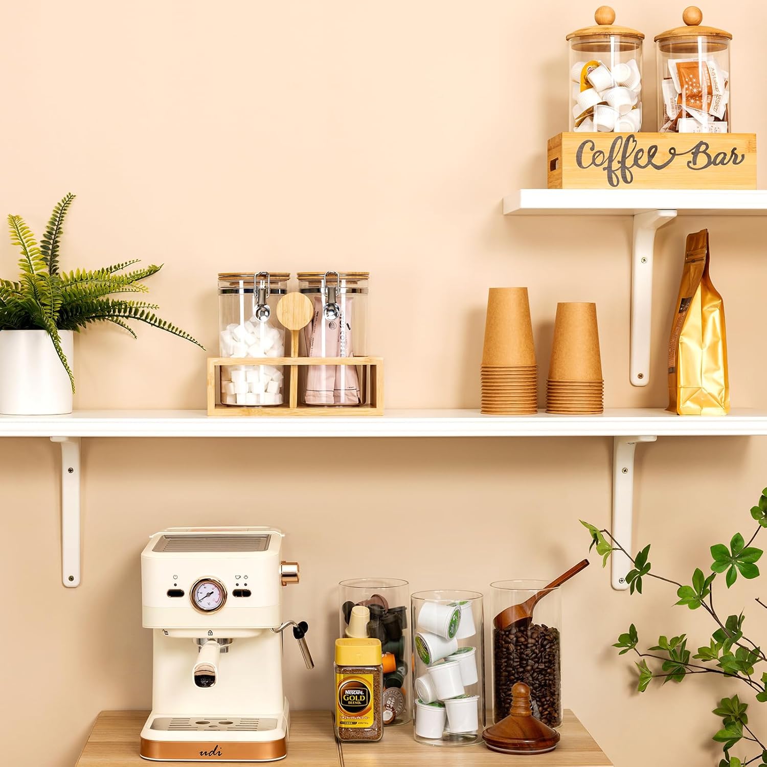 Yangbaga 2Pcs Coffee Sugar Canisters with Shelf, 38OZ Plastics Storage Containers for Ground Coffee Bean Storage with Lid Airtight Locking Clamp and Coffee Scoop, Food Storage Jar for Kitchen