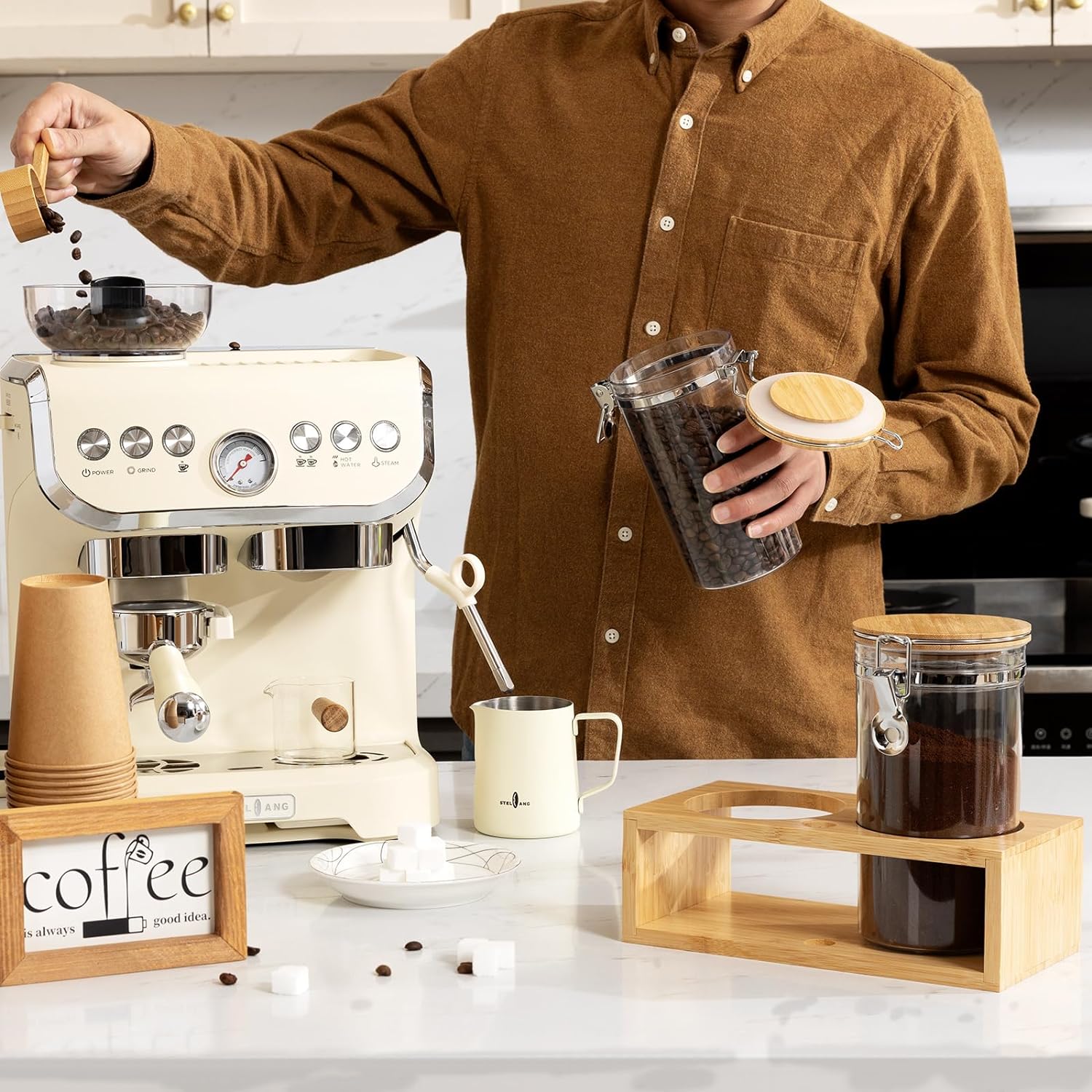 - COFFEE BAR ORGANIZER:There is a wooden spoon for food scooping. After you use the spoon.And you can put it directly on the log holder without messing up the tabletop.The lid, spoon and stand are the same color which could be a great decor.