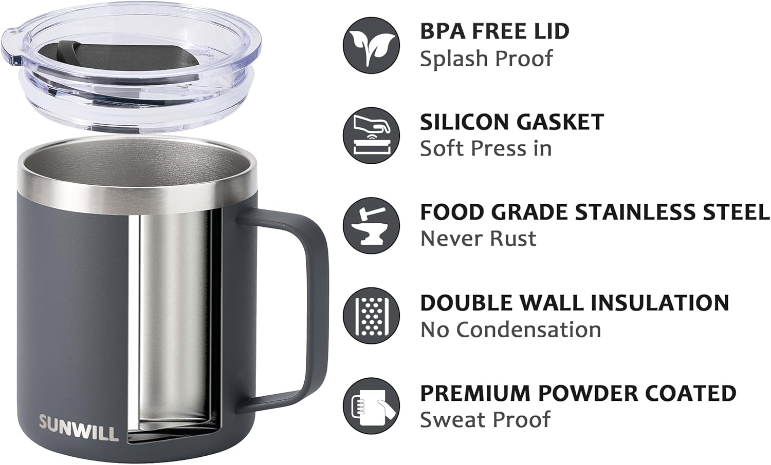 SUNWILL Travel Coffee Mug with Lid, Insulated Tumbler with Handle, 14 oz Stainless Steel Cup for Home, Office, Camping, Powder Coated Charcoal