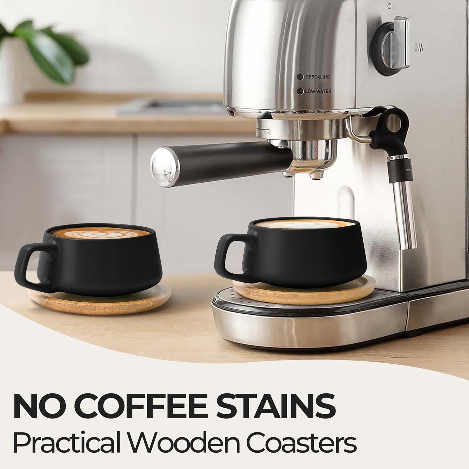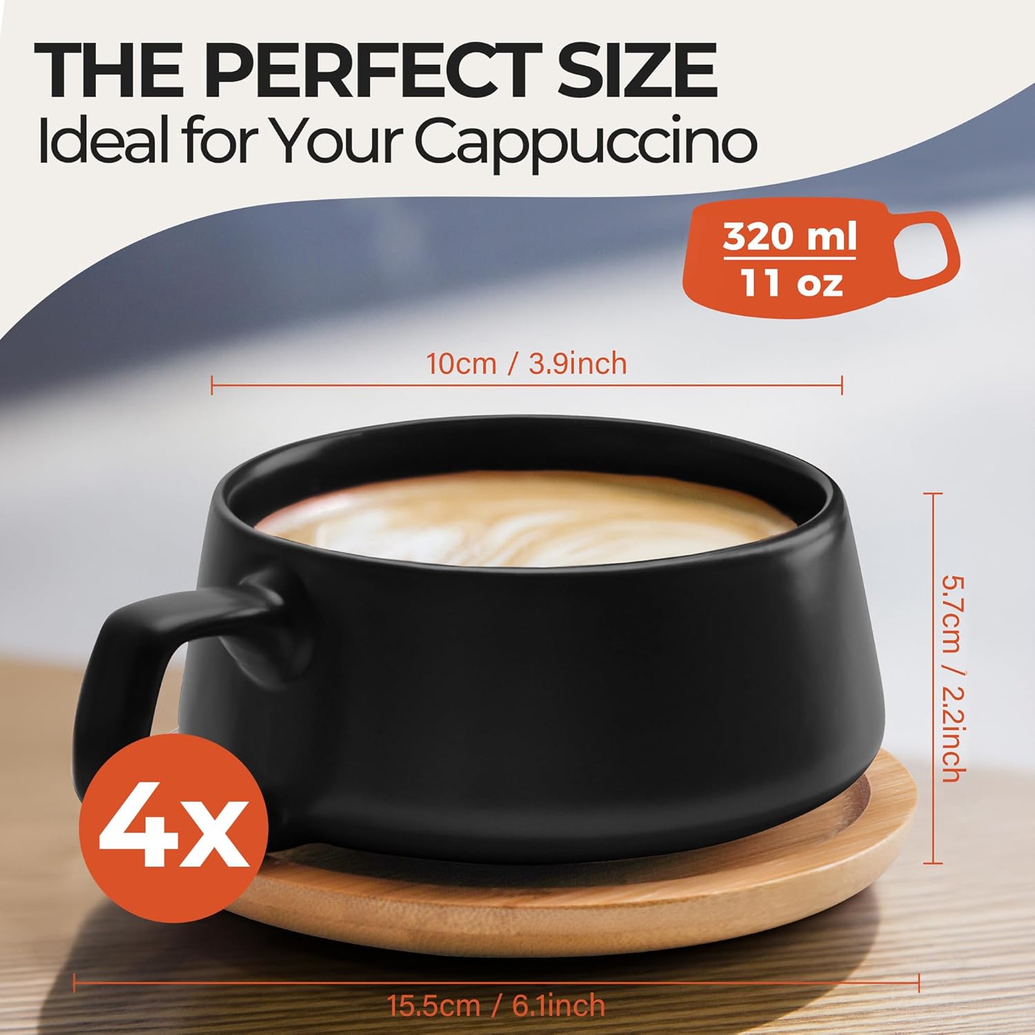 MIAMIO – 11 Oz., Set of 4 Ceramic Tea Cup and Saucer Bamboo/Tea Mug - Wide Cappuccino Cup, Coffee Cups Ceramic Mug for Cappuccino, Latte, Espresso & Americano - Luxe Collection (Black)