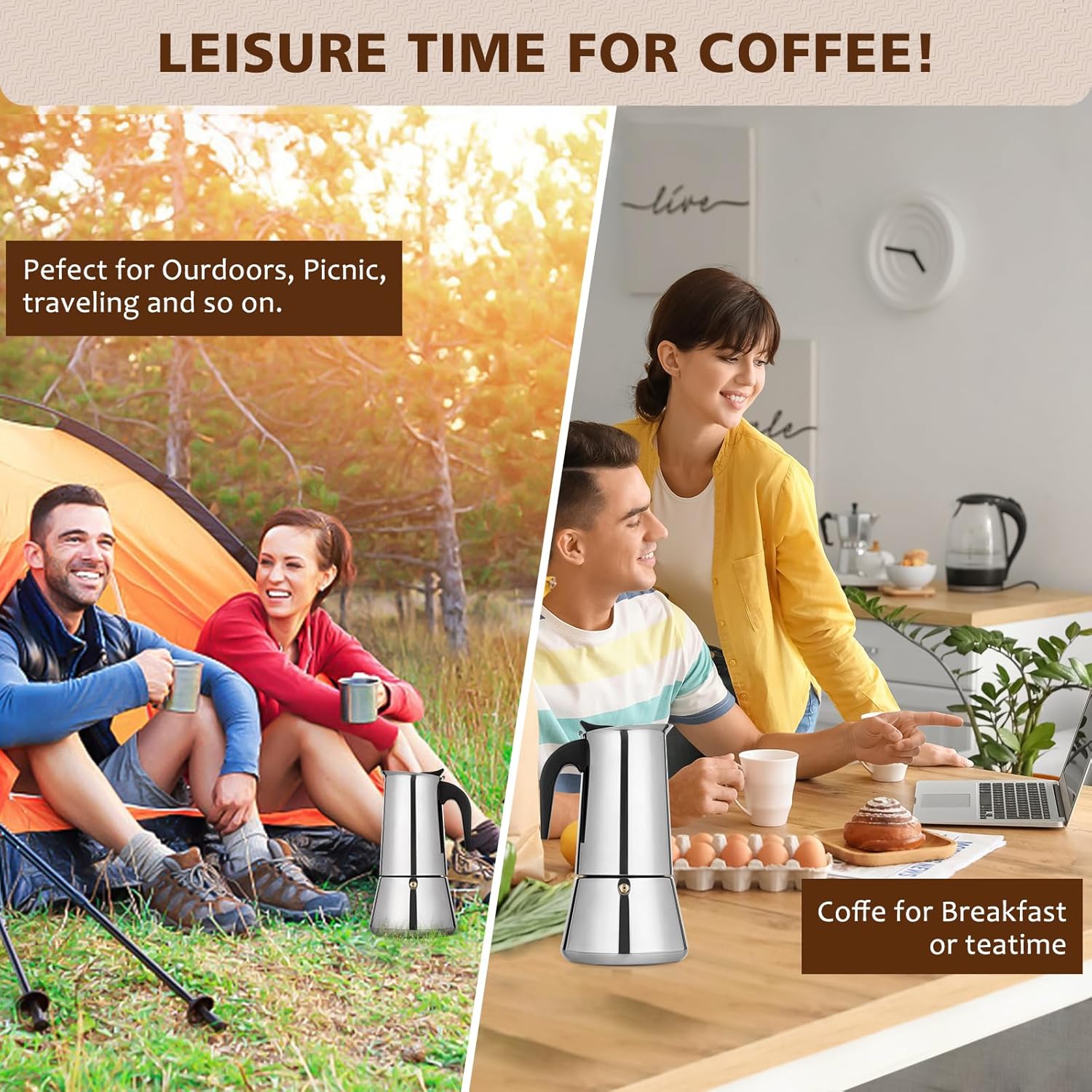 - ☕ ★Suitable for all Hobs★ The Italian coffee maker is suitable for a variety of stoves including induction cooker (The minimum coil requirement for induction is greater than 95mm), ceramic stove, alcohol stove, stove gas, etc.Only 3-5 minutes, you can taste the rich coffee.(Note: It is normal that the stainless steel turns black after use in the fire, it does not affect the use, it can be cleaned with a cleaner stainless steel.)