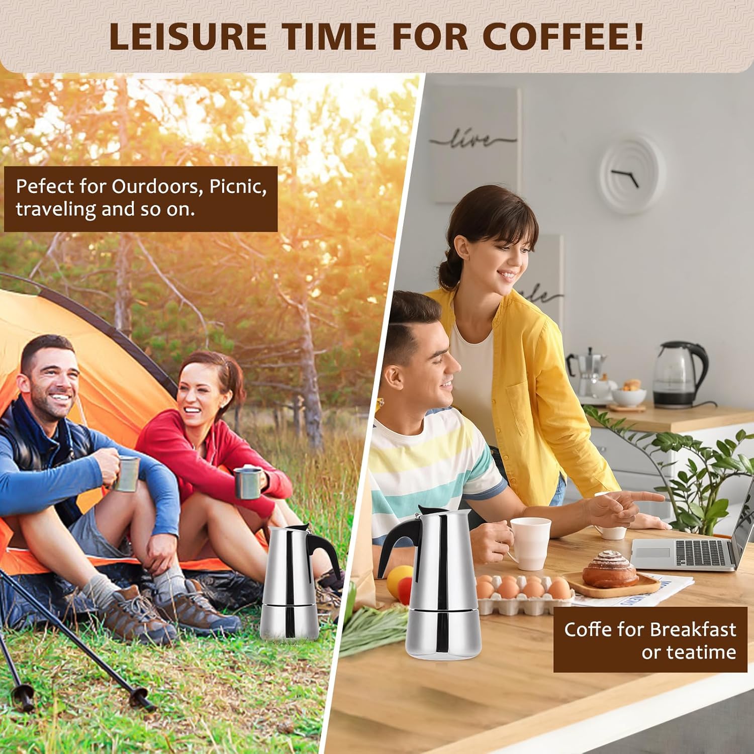 - ☕ ★Suitable for all Hobs★ The Italian coffee maker is suitable for a variety of stoves including induction cooker (The minimum coil requirement for induction is greater than 95mm), ceramic stove, alcohol stove, stove gas, etc.Only 3-5 minutes, you can taste the rich coffee.(Note: It is normal that the stainless steel turns black after use in the fire, it does not affect the use, it can be cleaned with a cleaner stainless steel.)