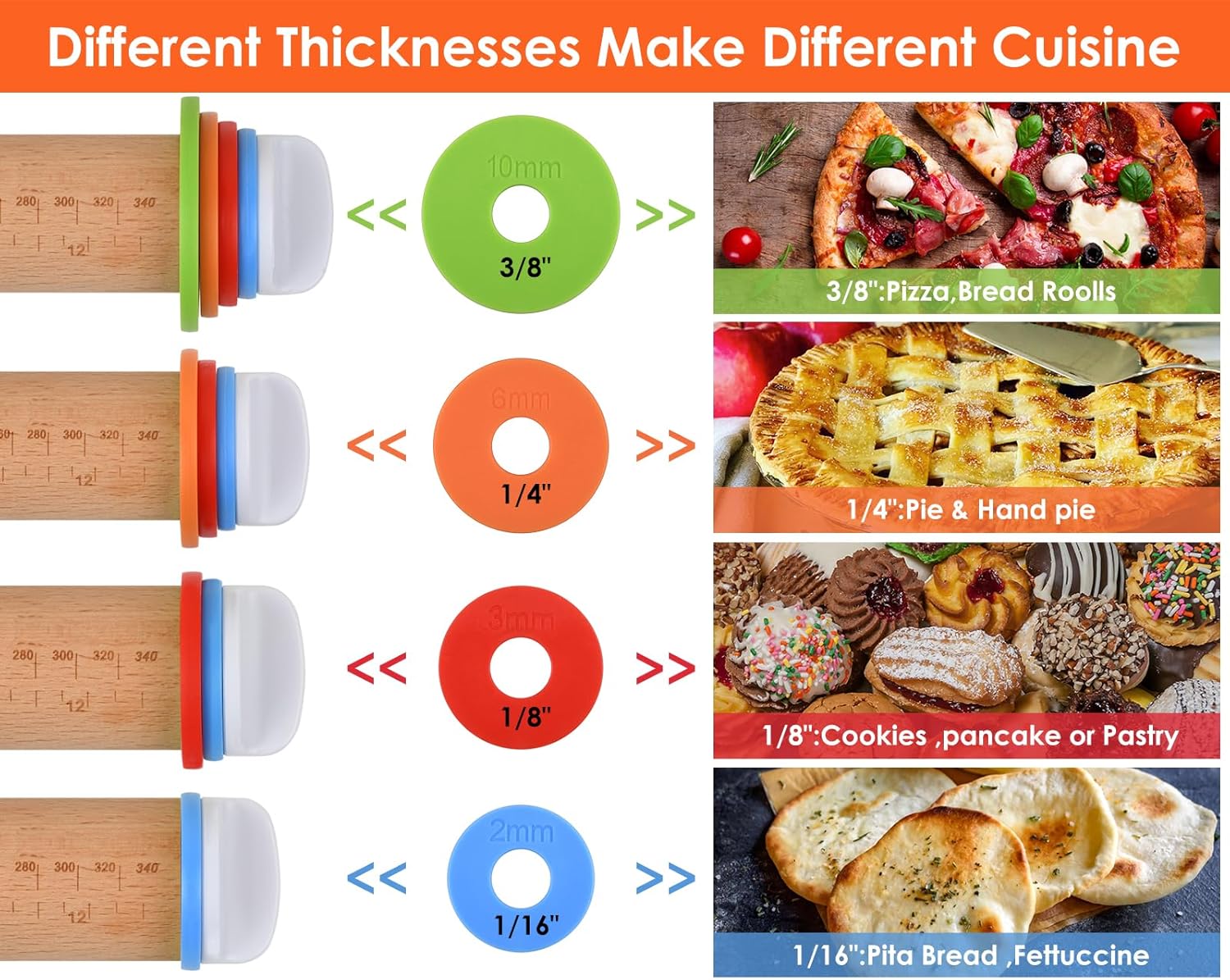 - Consistent Dough Thickness - Elevate your baking experience with the convenience of four removable and adjustable discs on each side. Easily roll out dough to precise thicknesses of 1/16", 1/8", 1/4", and 3/8", ensuring uniformity in every batch