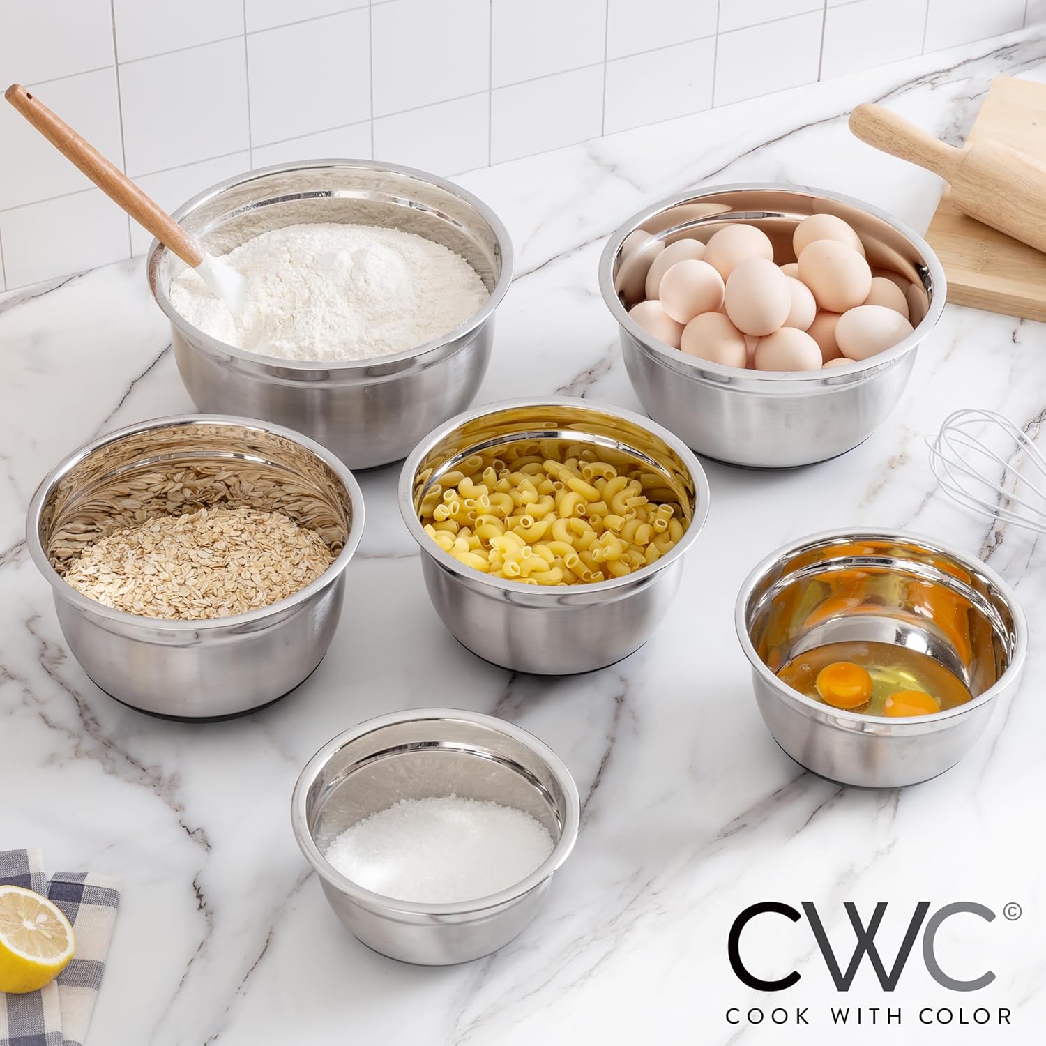 - 6 Piece Stainless Steel Nesting Bowls Set includes 6 Prep Bowl and Mixing Bowls with lids - a practical set of easy to clean kitchen bowls that can be used for food prep, serving and storing.