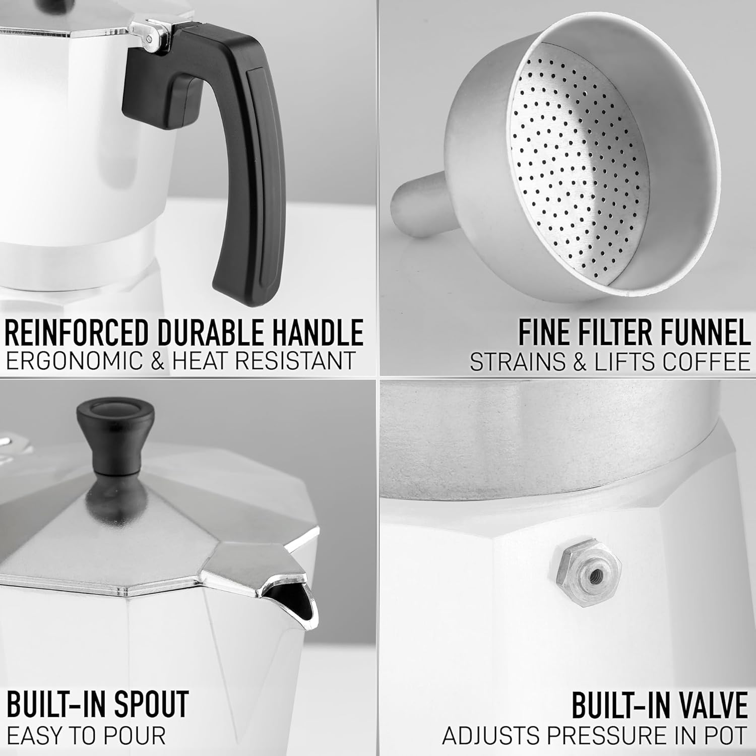 - PREMIUM QUALITY DESIGN: Our Italian coffee maker crafted with a durable, food-grade cast aluminum body, the classic Italian design of this espresso pot ensures quick and even heat distribution for a rich and velvety coffee flavor. This stove top espresso coffee maker has a built-in safety valve to regulate pressure inside the espresso pot for higher caffeine extraction. This espresso maker stove top is designed with a heat-resistant handle, lid knob, and a built-in spout for easy pouring.