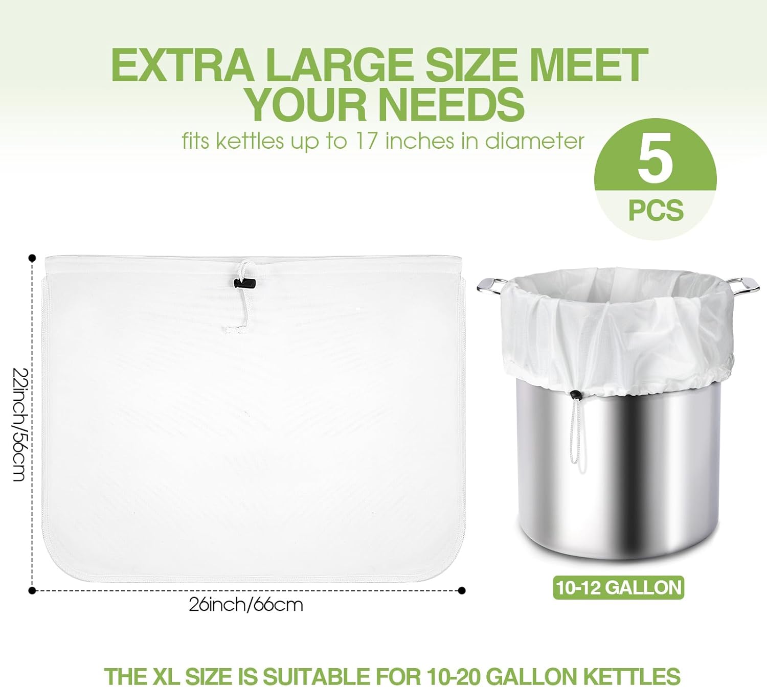 - Extra Large Size: the strainer bag size is 66 x 56 cm/ 26 x 22 inch which ensure you can brew even the largest of recipes without spilling any grain. It will fit different kettles up to 17 inches in diameter. It can also satisfy for versatile needs such as jelly strainer, cider press, grape press, nut milk bags, this cold brew bags can do it all