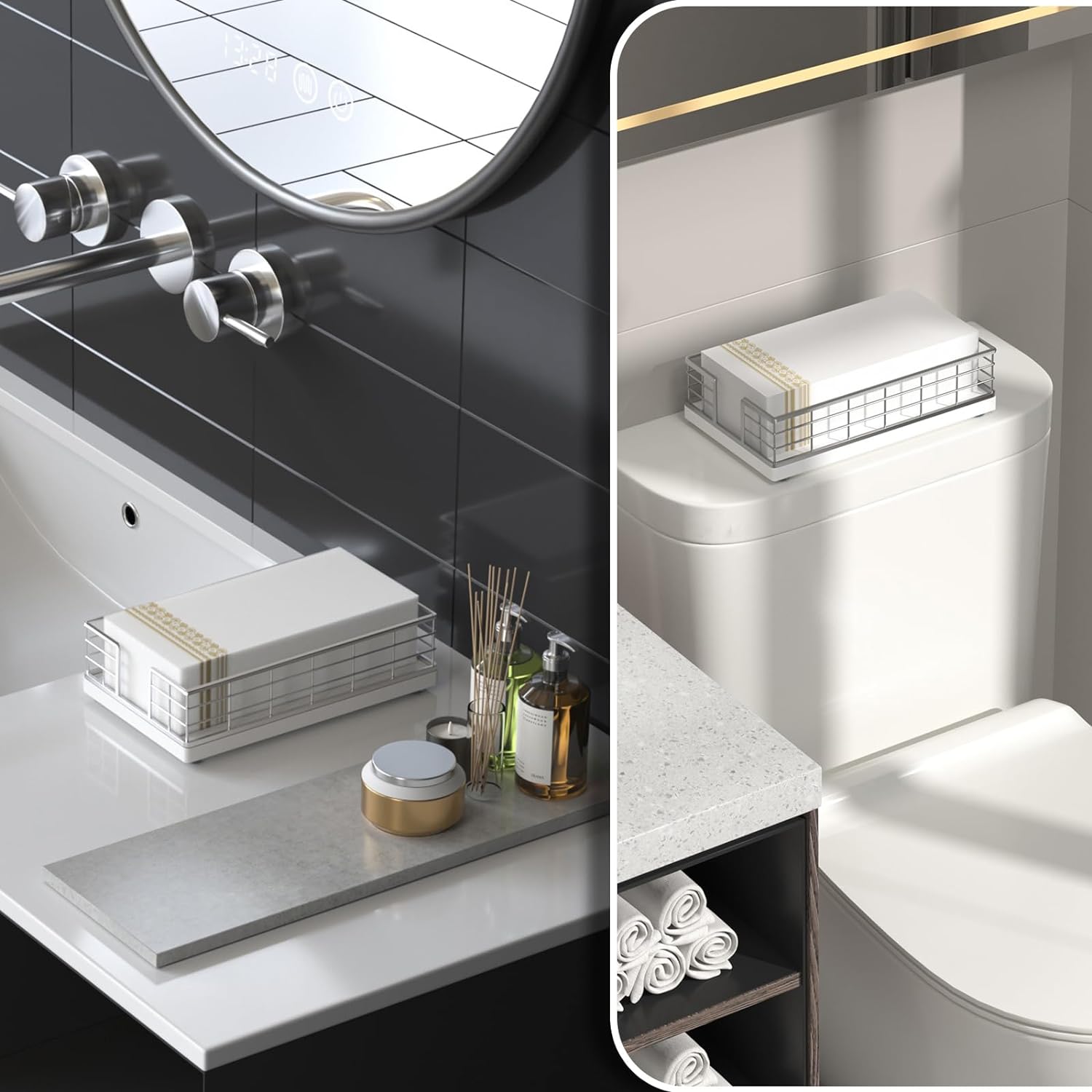 Wican Guest Towel Holder Tray for Bathroom, Oak and Iron Napkins Holder for Powder Room Dinning Table Wooden Basket for Disposable Paper Hand Towels Silvery and White