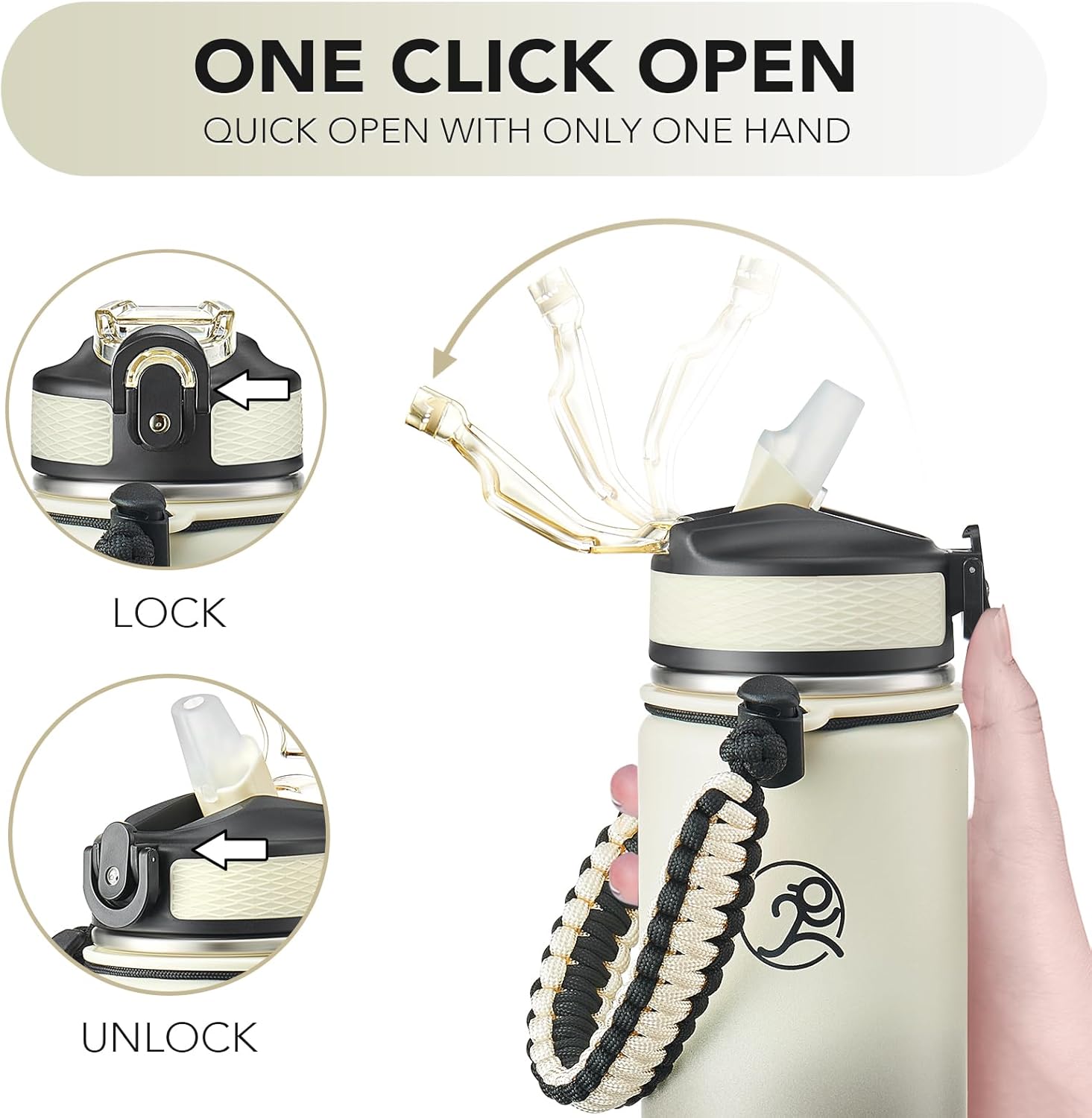 - Insulated water bottle 24 oz: 24 oz insulated water bottle has a matte finish and comes with 2 lids (Lid with Straw/No Straw) and a Paracord handle for easy portability; Its wide mouth makes it easy to fill, pour, and clean, and the leak-proof cap ensures worry transport.