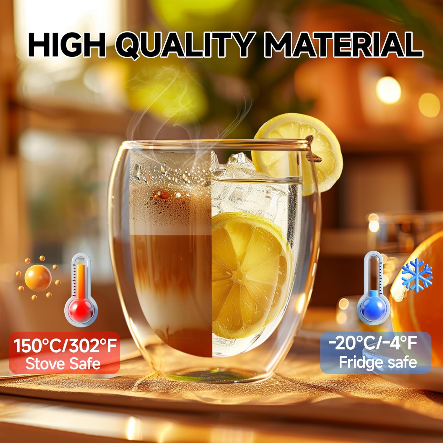 - 【DOUBLE WALL DESIGN】 - The double walled glass coffee mugs design of this utilizes double-layer technology. When the inner layer becomes hot, the outer layer will not heat up, protecting your hand from scalding and maintain the temperature of the beverage.