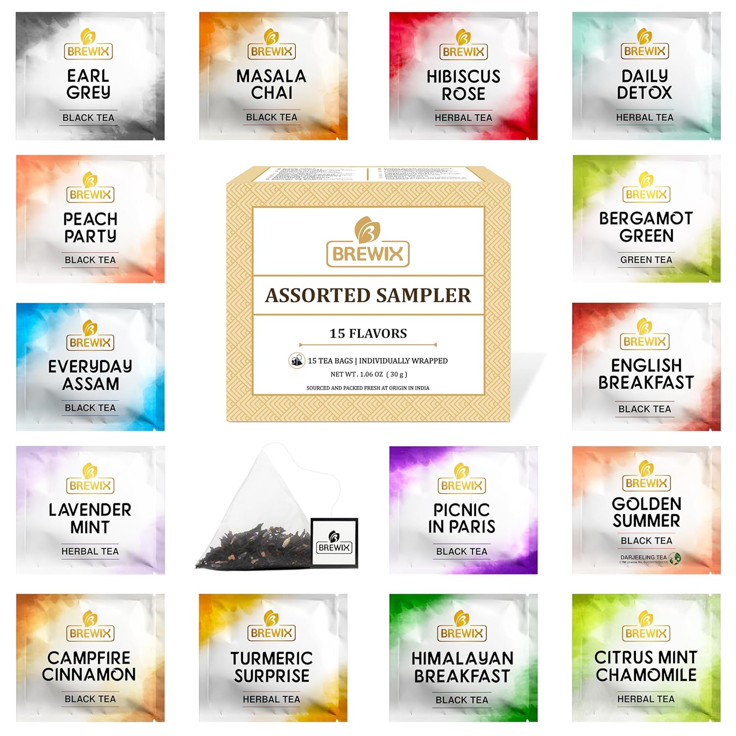 - ASSORTED TEA GIFT SET - This pack includes 15 different flavors of tea. Each of our 15 tea bags variety pack comes in a branded Brewix box making it a perfect tea gift set for any tea lover. A unique and unprecedented gourmet collection of highest-grade, small-lot teas