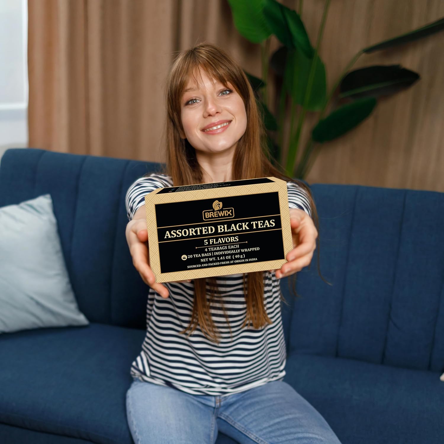 - ASSORTED BLACK TEA GIFT SET - This pack includes 5 different flavors and 4 tea bags each of Earl Grey, English Breakfast, Everyday Assam, Himalayan Breakfast and Golden Summer (Darjeeling). Each of our 20 tea bags variety pack comes in a branded Brewix box making it a perfect caffeinated tea gift set for any tea lover.