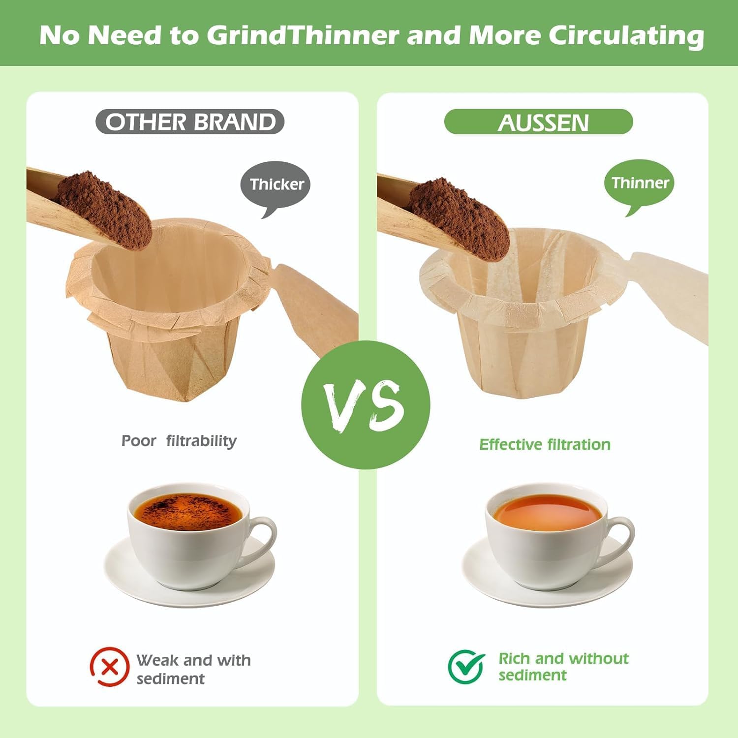 - 【Nice Thickness】: The filter paper neither too thin to be split up or leak, nor too thick to make the coffee weak. Thinner but better flow through.Fits Into Most K-cups Paper Filters,Easily Flow Through With Good Test No Grounds: good quality disposable coffee filters help you to make a nice cup of coffee with good taste. Filter paper can filter most of coffee grounds and make the taste more silky and crema rich