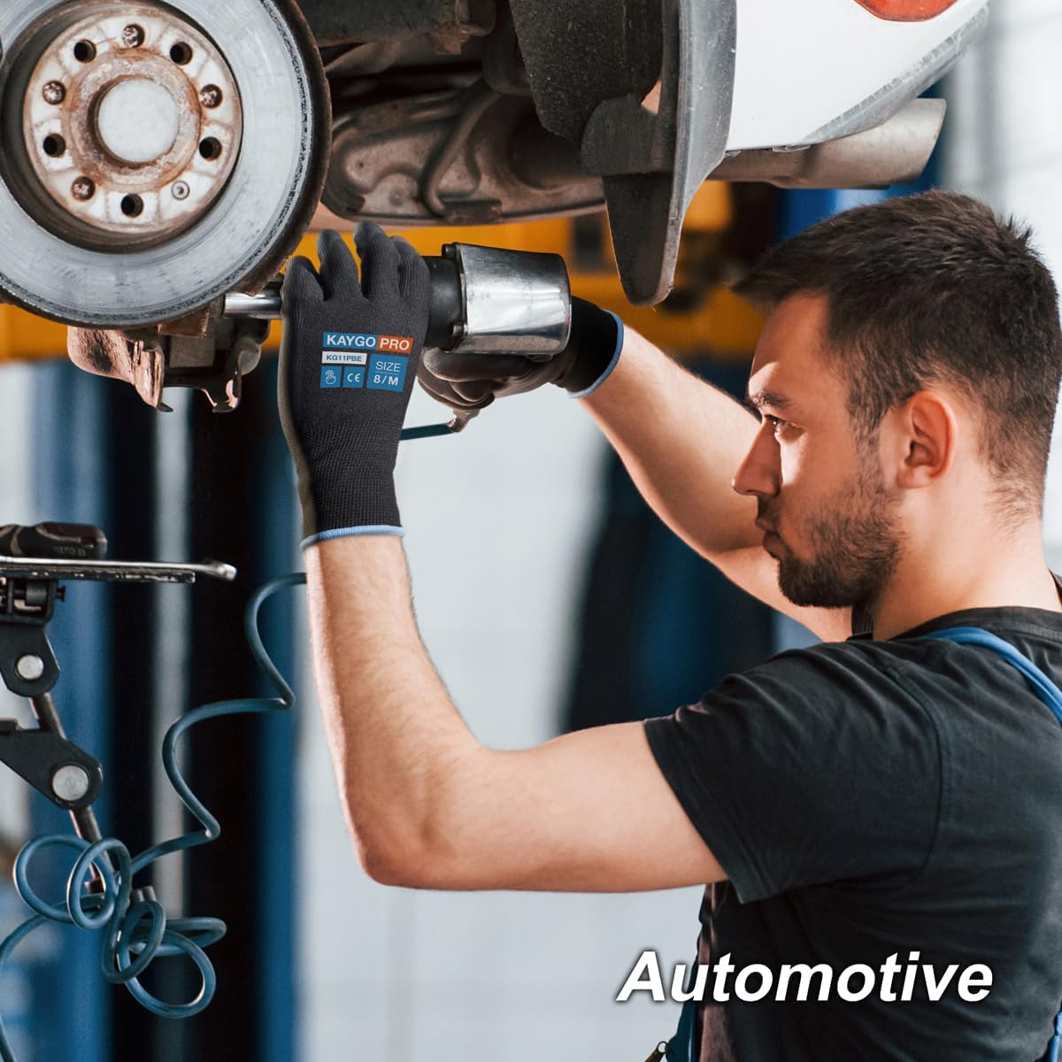 KAYGO Safety Work Gloves PU Coated for Men and Women, 60 Pairs KG11PB, Seamless Knit Glove with Two Fingers Touchscreen, breathable and lightweight Ideal for General Duty Work (Medium,Black)
