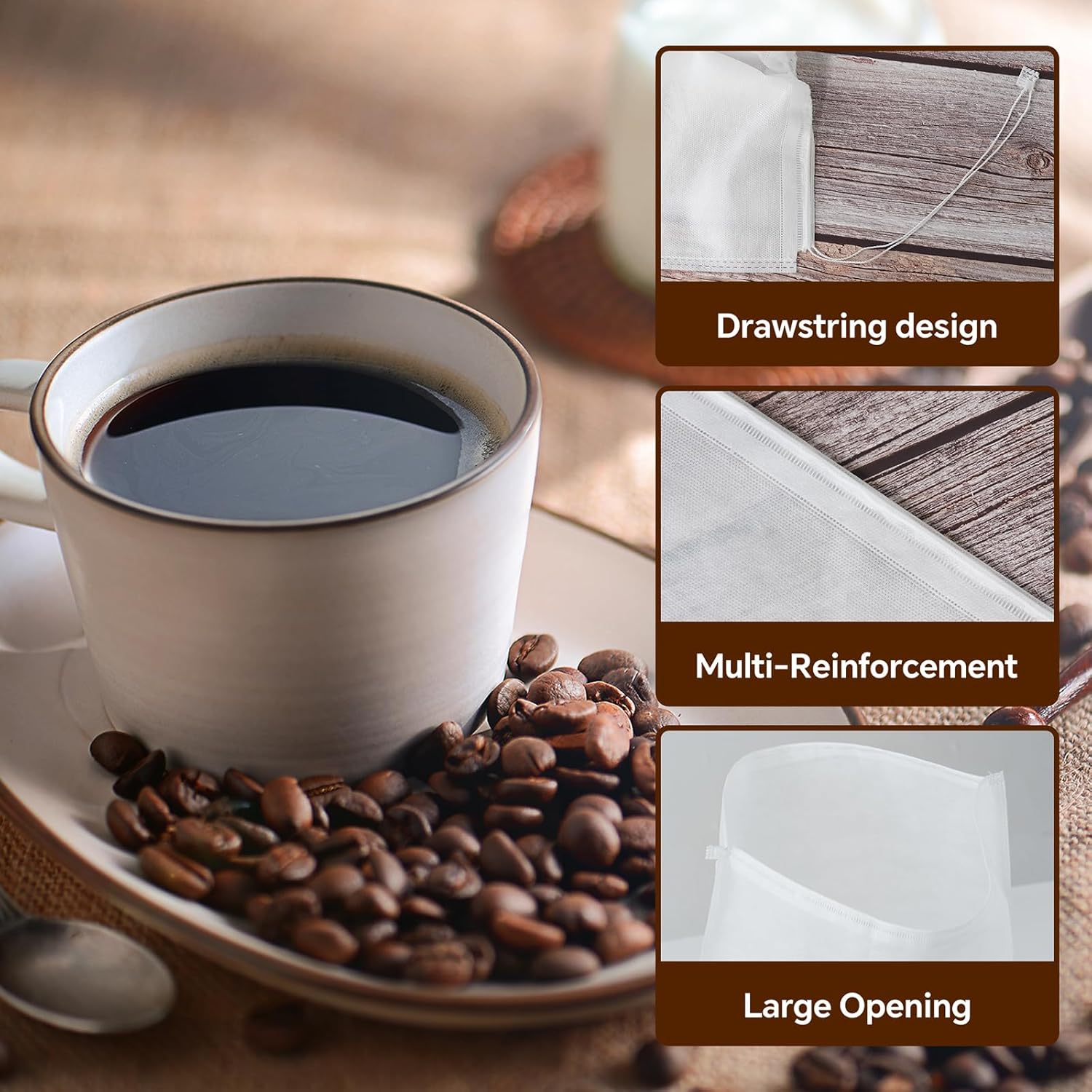 - STRONG and THICK COFFEE FILTER BAG:Made well and enhanced details.It made of thicker non-woven material,Multi-Reinforcement at seams.Will not tear at the reinforced edges even when wet,yetit easily captures all the tiny impurities, oils and bitterness in the coffee without causing any changes in the extraction or taste of the final product,helps you make better tasting coffee.