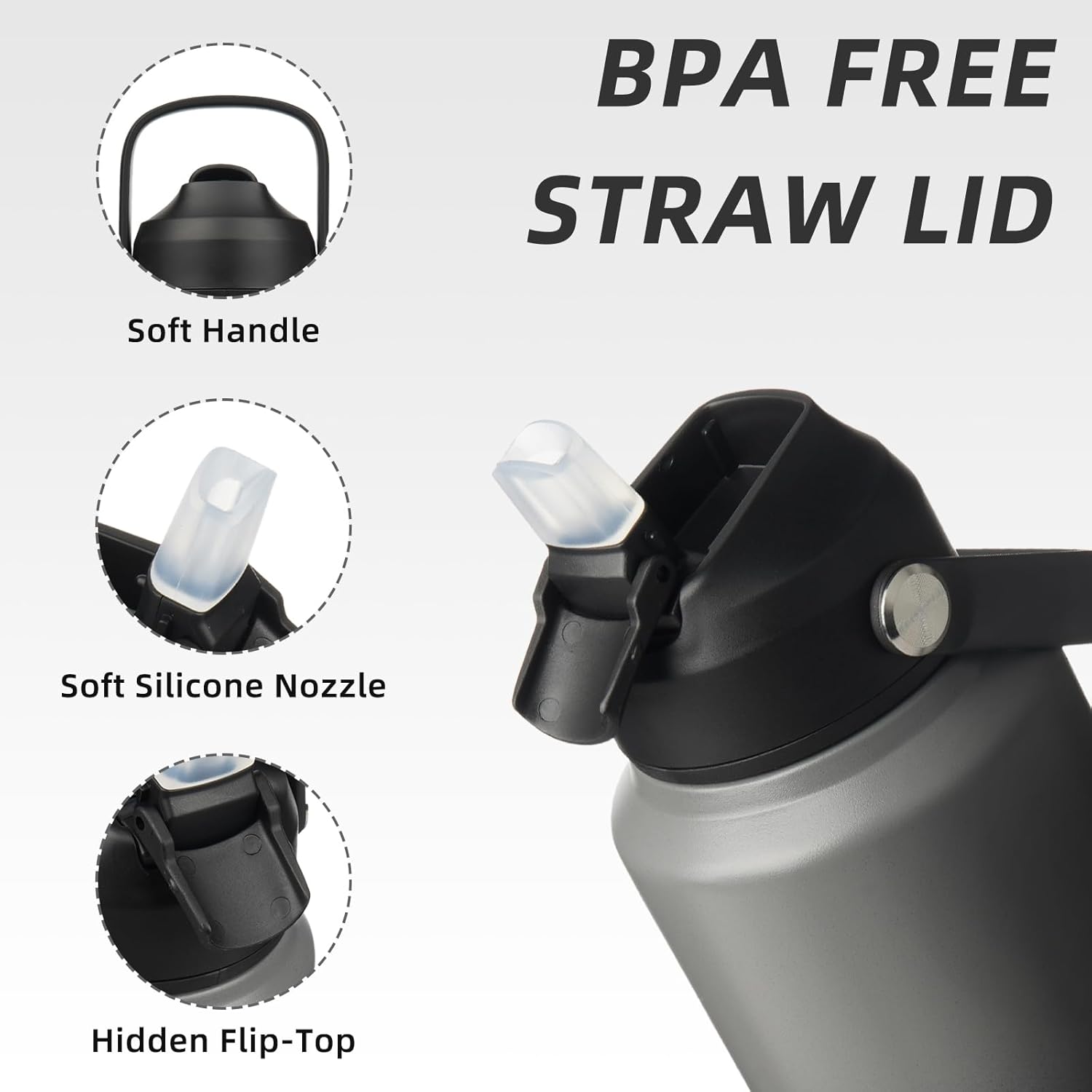 - INSULATED WATER BOTTLE WITH UPGRADED STRAW LID: BJPKPK insulated water bottle with straw lid use hidden flip-top Straw Lid to ensure open and close easily with one hand. The handle is soft and can freely rotate 180° for effortless carrying. Soft silicone nozzle will give you a better drinking experience. Upgraded hidden nozzle design can also keep the nozzle clean and ensure leakproof when it closed