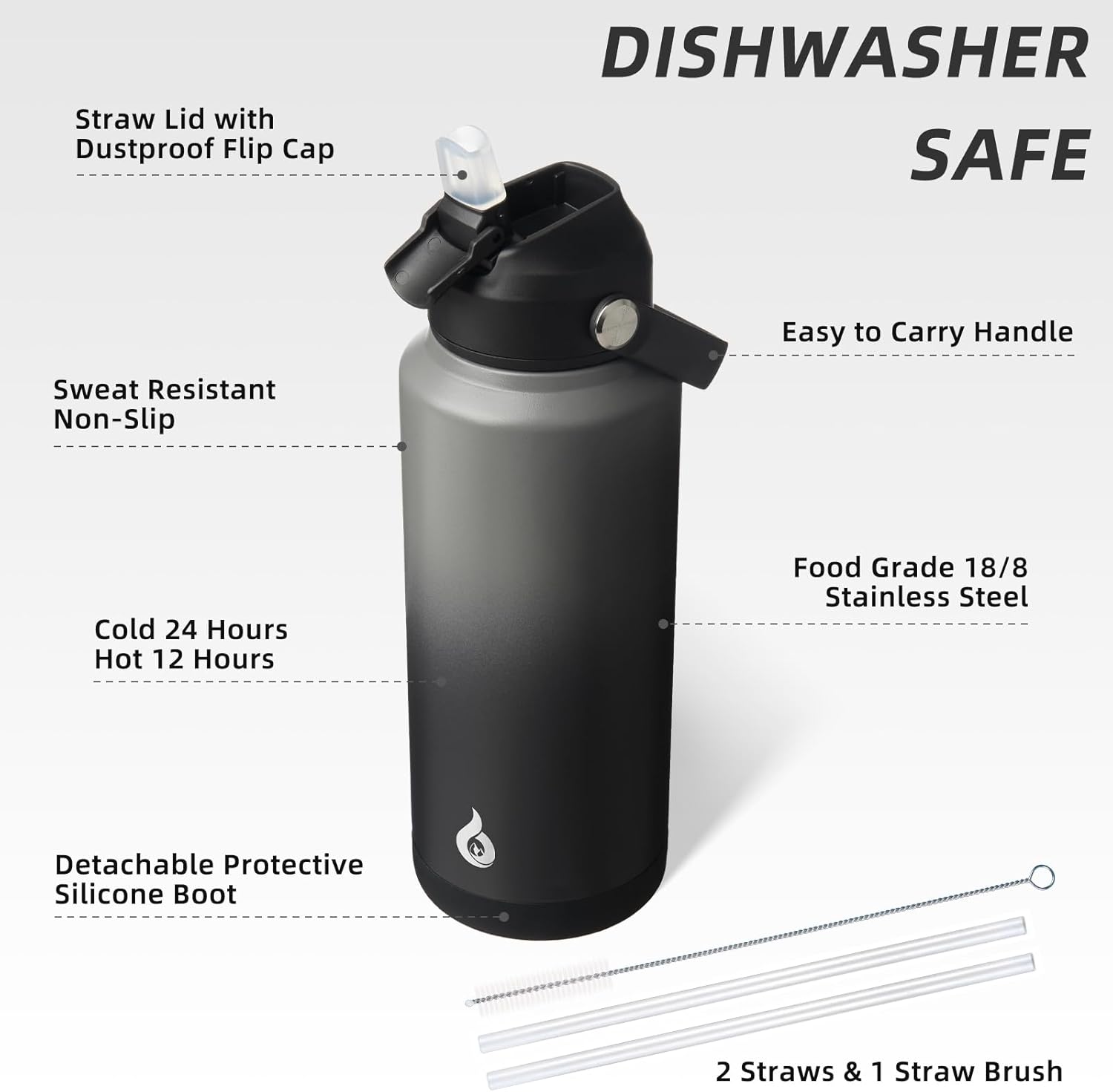 - NON-SLIP PROTECTIVE BOOT & DISHWASHER SAFE: This stainless steel water bottle comes with a detachable silicone boot to protect the bottom from bump damage. The wide mouth design of our water cup allows for easy filling, pouring, and cleaning. With 2 straws and 1 straw brush, you can easily clean the nozzle and straw with straw brush. It is also dishwasher safe, saving you time and effort in maintaining its cleanliness and hygiene