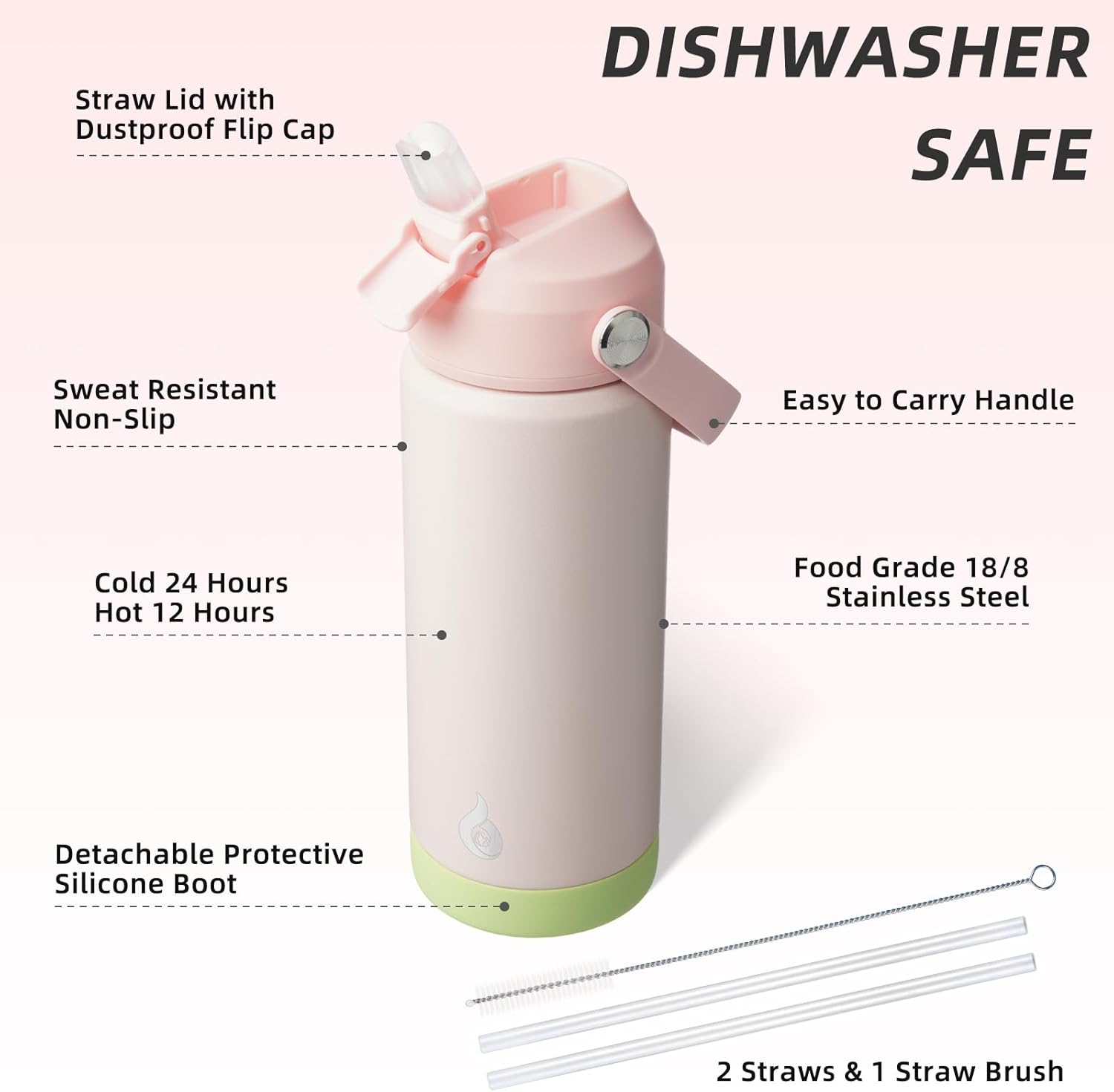 - NON-SLIP PROTECTIVE BOOT & DISHWASHER SAFE: This stainless steel water bottle comes with a detachable silicone boot to protect the bottom from bump damage. The wide mouth design of our water cup allows for easy filling, pouring, and cleaning. With 2 straws and 1 straw brush, you can easily clean the nozzle and straw with straw brush. It is also dishwasher safe, saving you time and effort in maintaining its cleanliness and hygiene