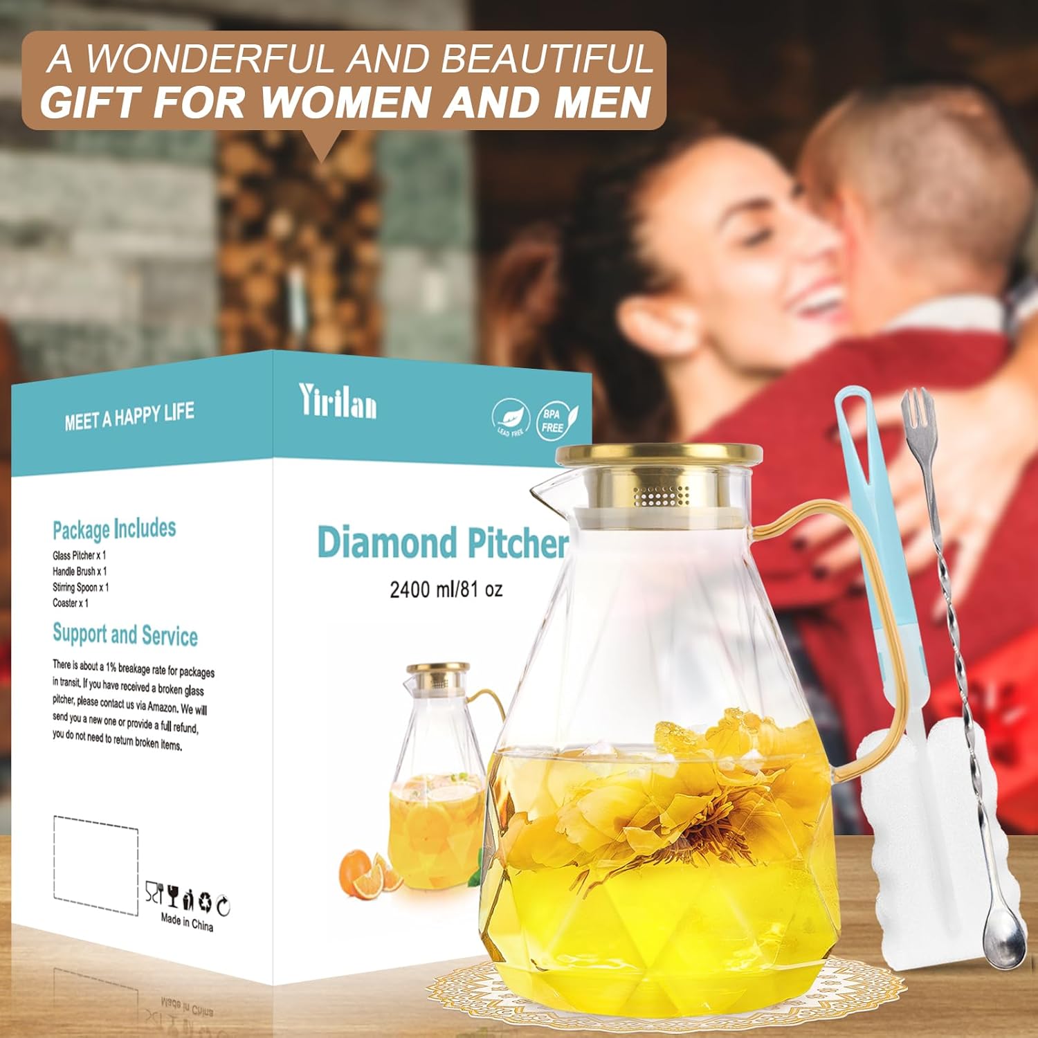 - A Wonderful Choice As A Gift: The practical and beautiful juice pitcher can basically meet your family's daily needs. I bet you will need a gift for Serving on Christmas, New Year's Day, Easter, Halloween, housewarmings, and Other parties. This glass jug has durable glass, an elegant body, and beautiful color box packaging, It is a beautiful gift for women and men