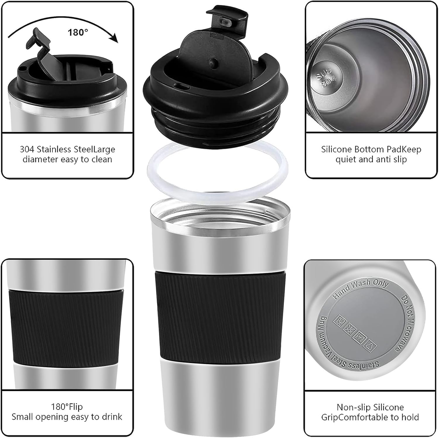 YINBAOGE Insulated Travel Coffee Mug Spill Proof Leak Proof Pobtable To Go Camping Stainless Steel Coffee Tumbler Reusable Coffee Cups with Lids Thermos for Hot and Cold Drink (Silver black, 12 OZ)