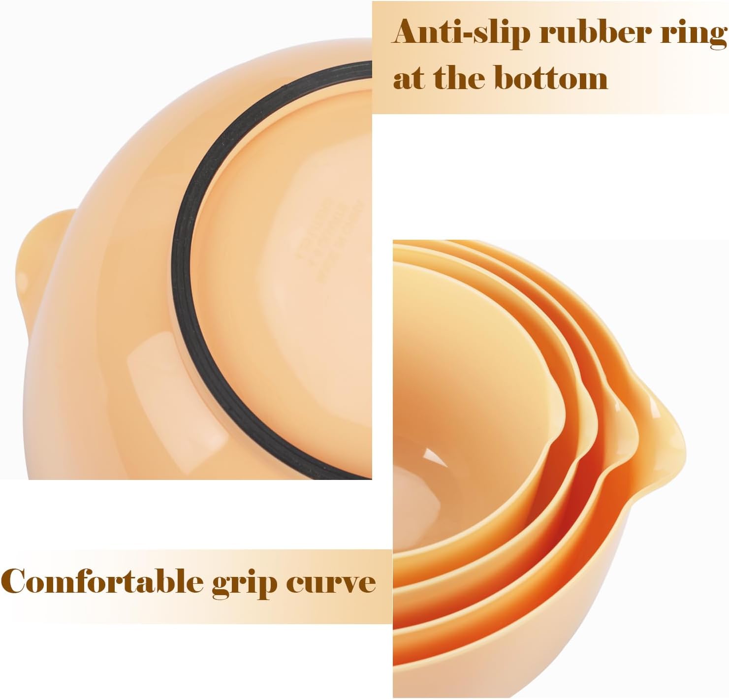 - 【Anti-Slip & Practical】There is non-slip rubber at the bottom of the plastic bowl, it can prevent slipping efficiently during the mixing. And compared with traditional mixing bowls, they are resistant to impact and lightweight enough, you will not worry about the smash, rust, or too heavy to handle at all. Versatile in use, not only does it can used as mixing bowl, double as convenient containers as fruit bowl, salad bowl, batter bowl, cereal bowl or even as popcorn bowl.
