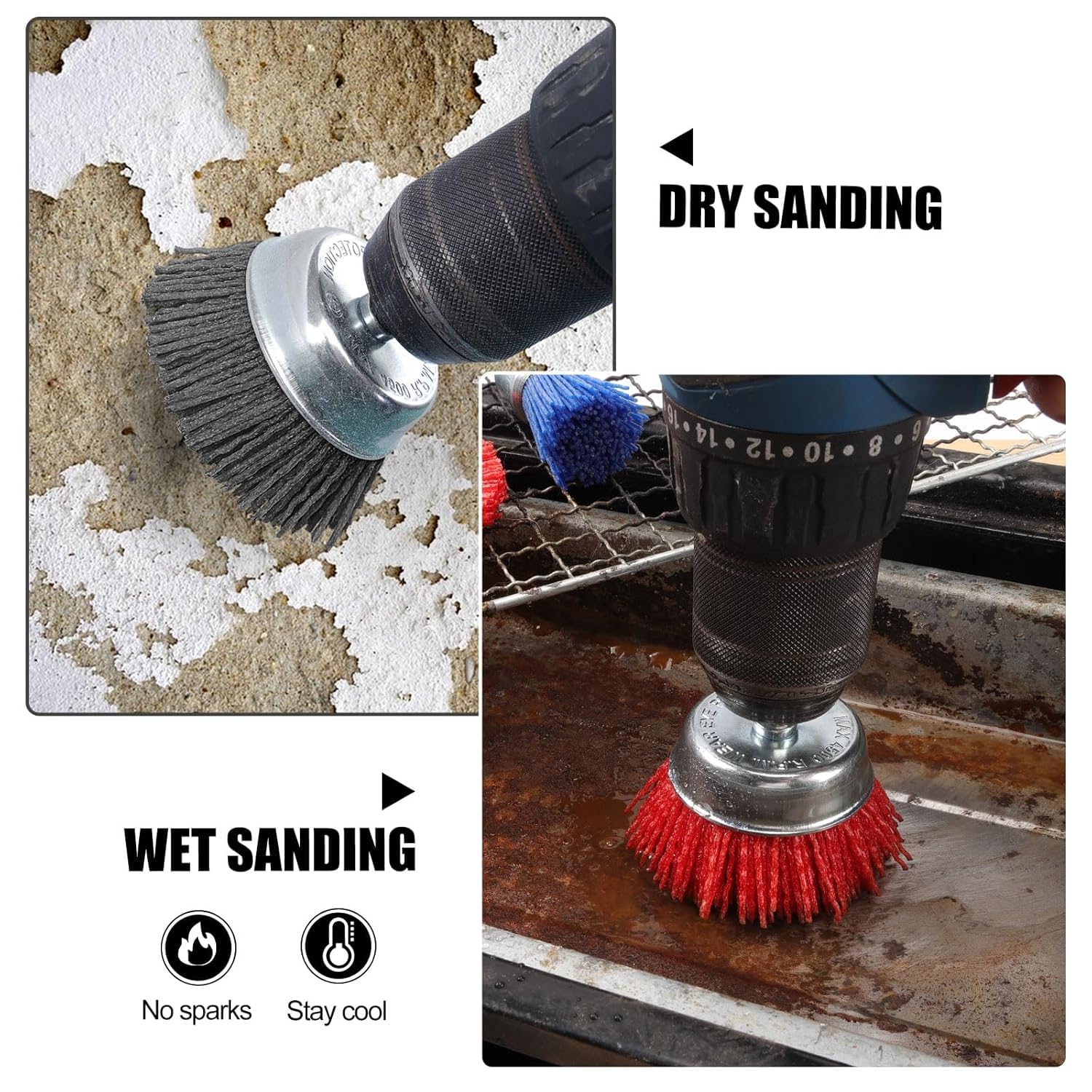 POLIWELL Nylon Filament Brush 9 Pack, Abrasive Wire Brush Wheel & Cup Brush Set, Drill Bit Sanding Brush with 1/4” Hex Shank for Steel Rust Removing, Grill Cleaning, Flaking Paint Refinishing