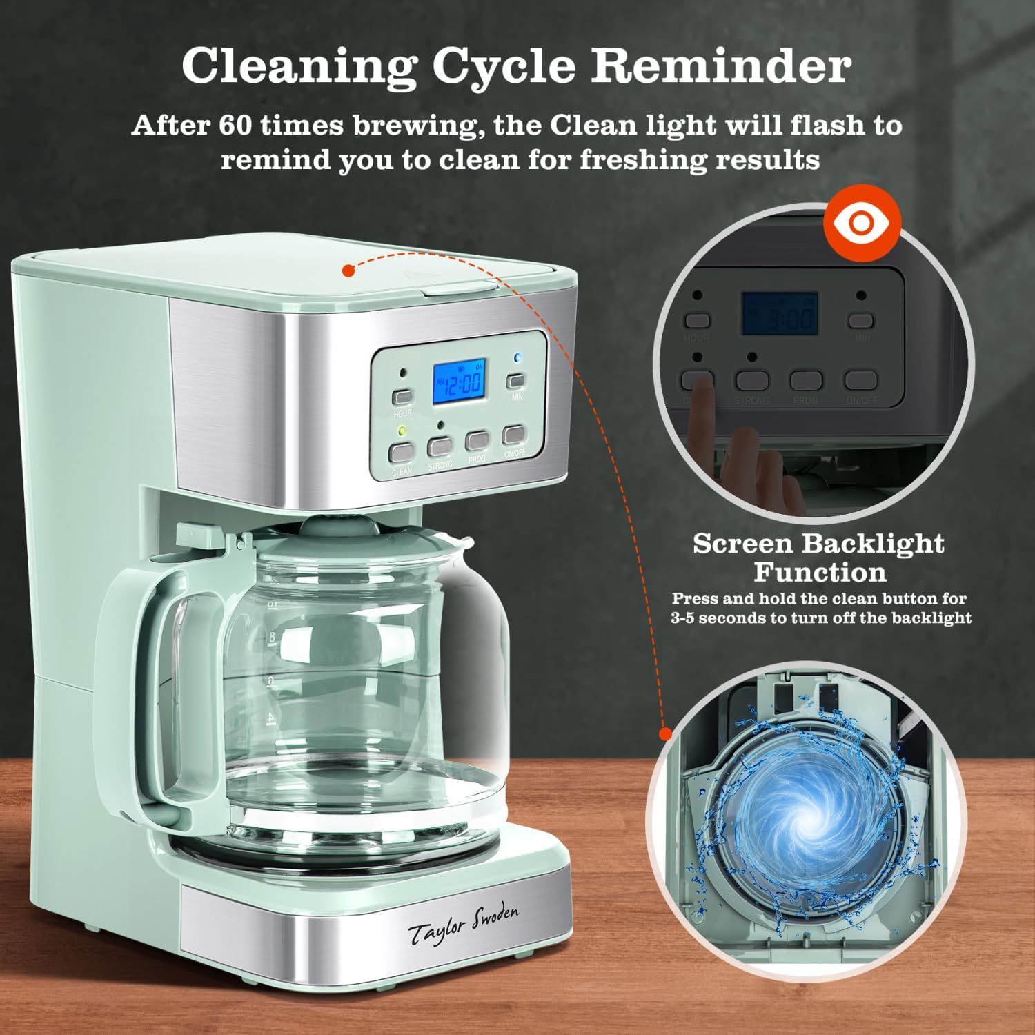 Taylor Swoden 12-Cup Programmable Coffee Maker, Regular & Strong Brew Drip Coffee Machine for Home and Office, Glass Carafe, Pause & Serve, Auto Shut Off, Green & Stainless Steel