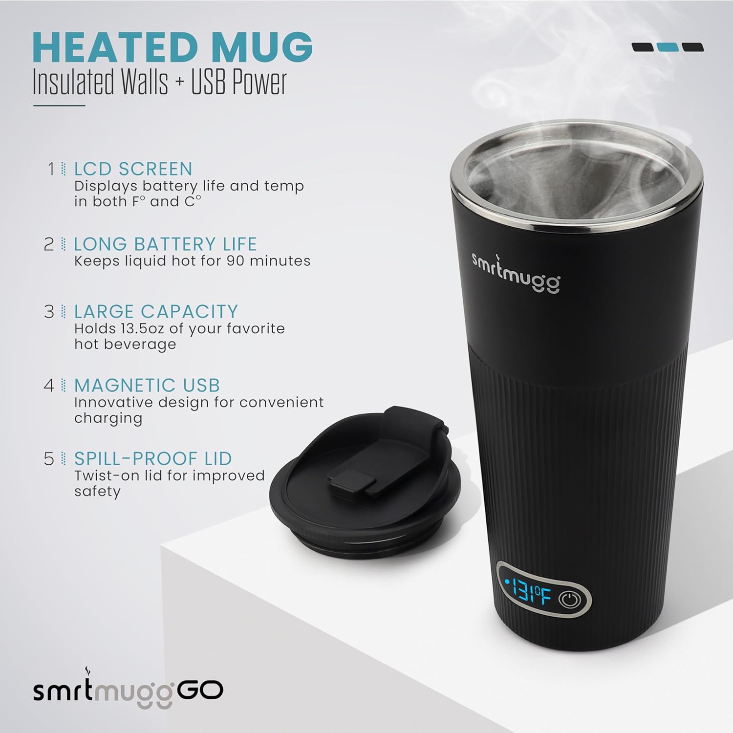 GO Heated Coffee Mug, Travel Mug, 13.5 OZ. Smart Mug, Battery Powered Heated Coffee Mug, Great for Coffee and Tea, Snap on Magnetic Charging Cord, New and Improved (Black)