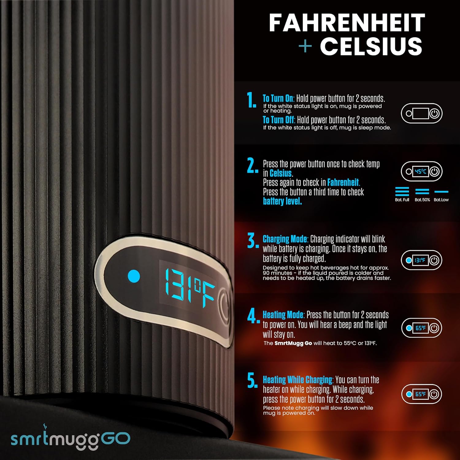 - ✅ Super Simple Operation. Simply press and hold the button to turn the mug on, and that's it! The SmrtMugg go's simple operation let's you quickly take your coffee on the Go.