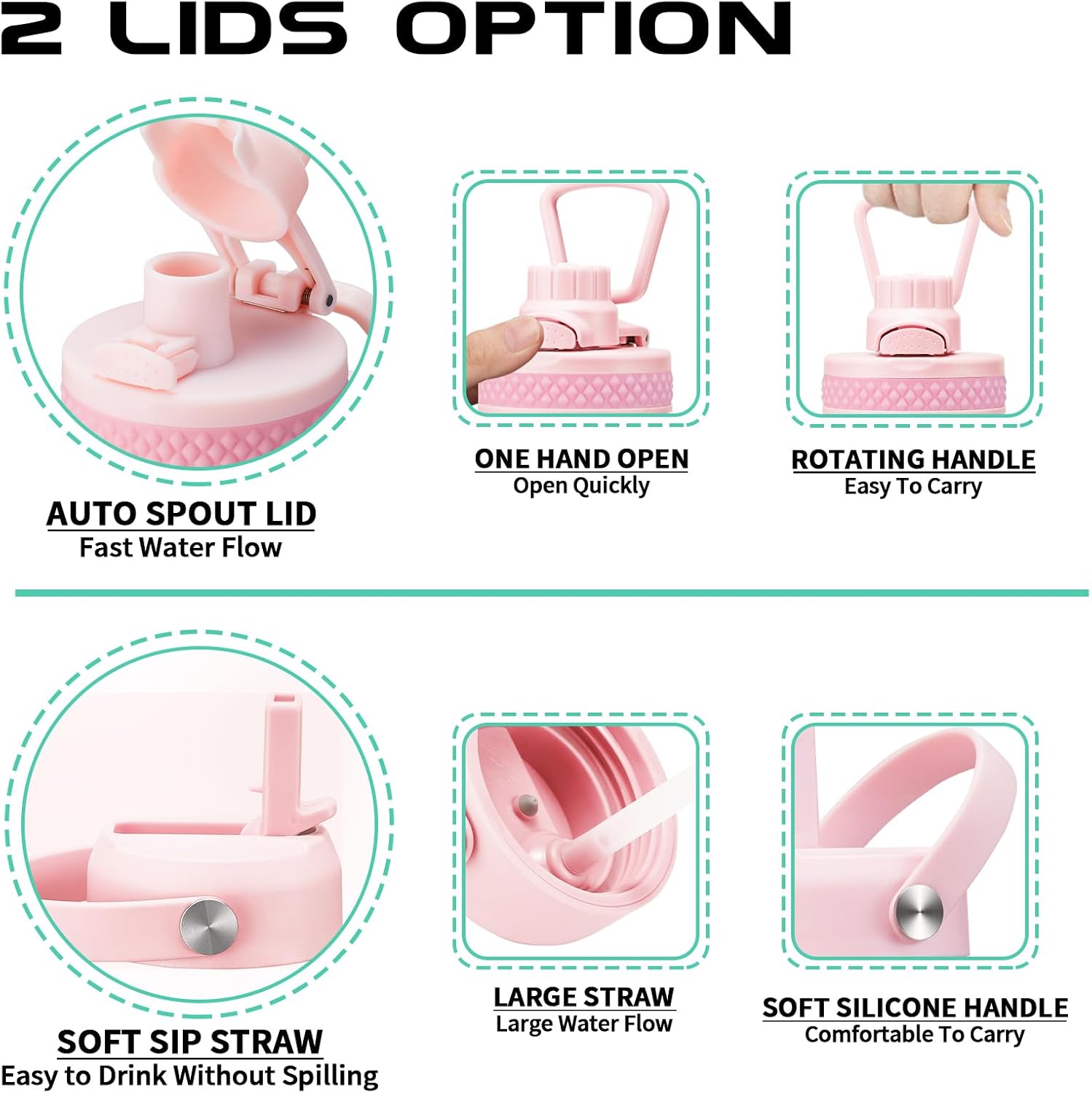 - 2 LIDS—100% Leak Proof: the auto spout cap & straw lid provide your different drinking experience. The ONE-HAND operation pop-up spout lid for convenient enjoy your fast water flow. The SPILL-PROOF straw lid with high flow rate & BPA free. Both 2 lids design with a sturdy handle, making the insulated water bottle more convenient to carry