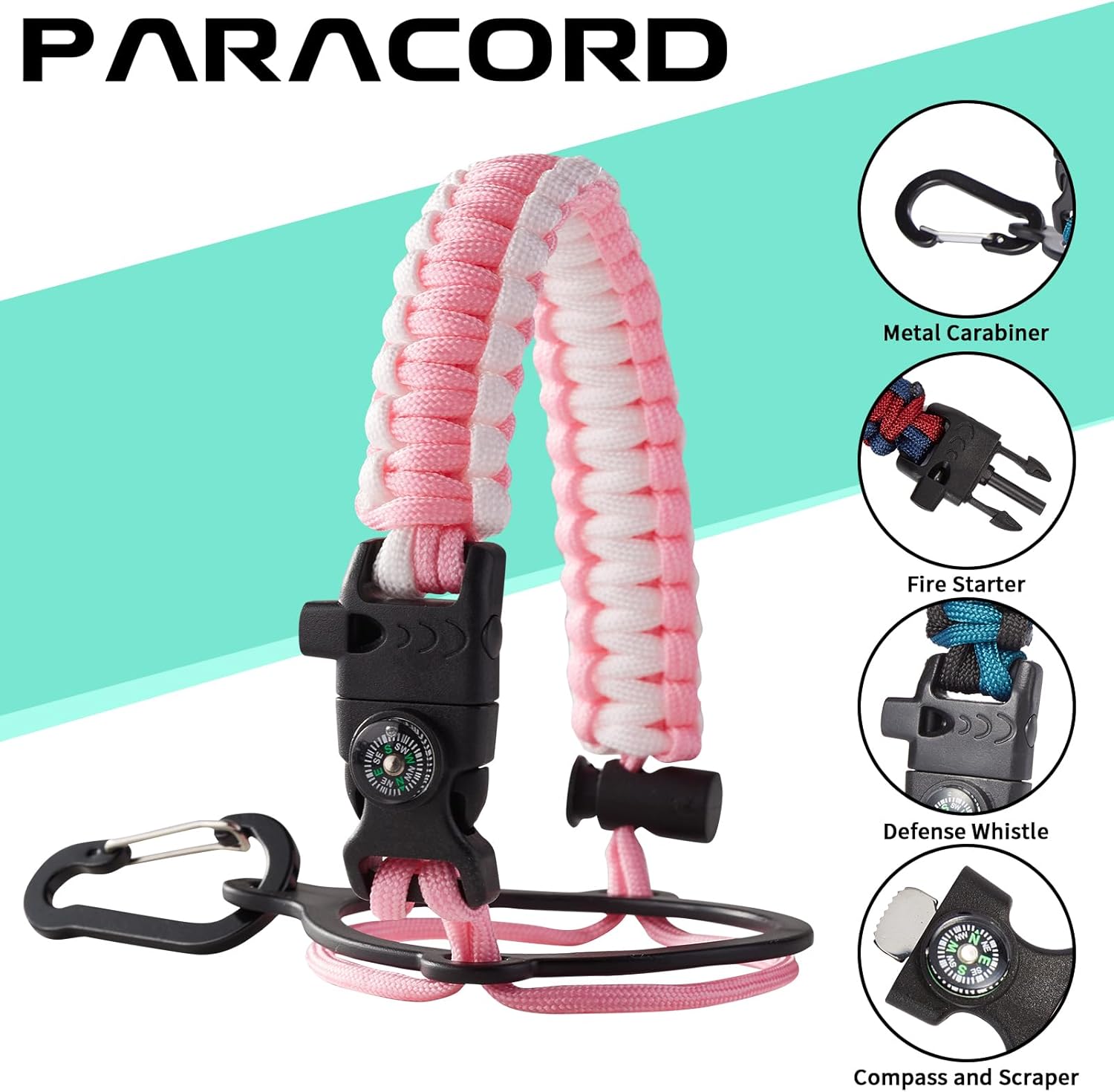- UNIQUE PARACORD—Perfect Accessories: bright color paracord matches the flask water bottle to give you a youthful vibe while adding a personal style. It comes with a compass, safety loop, metal carabiner, flint, igniter, and whistle to become your survival tool for your wild adventures
