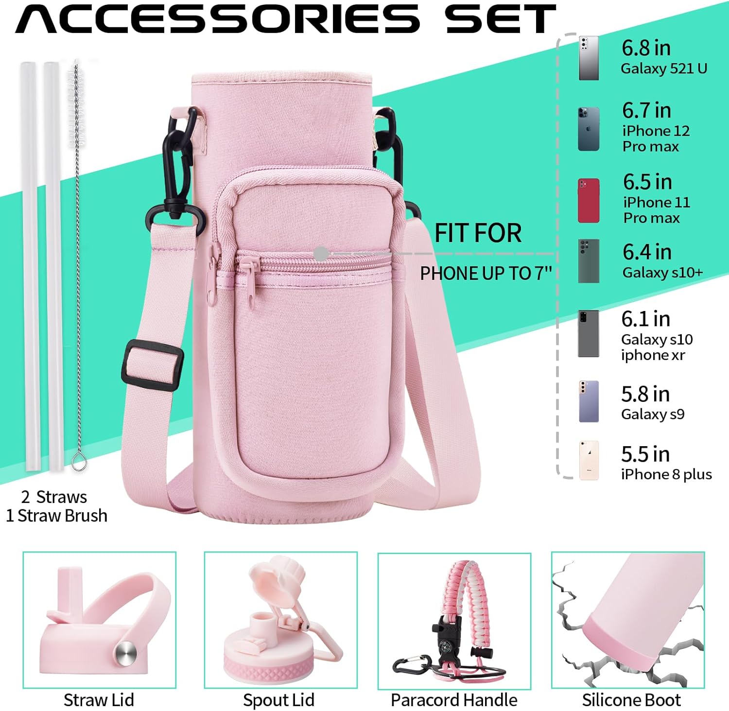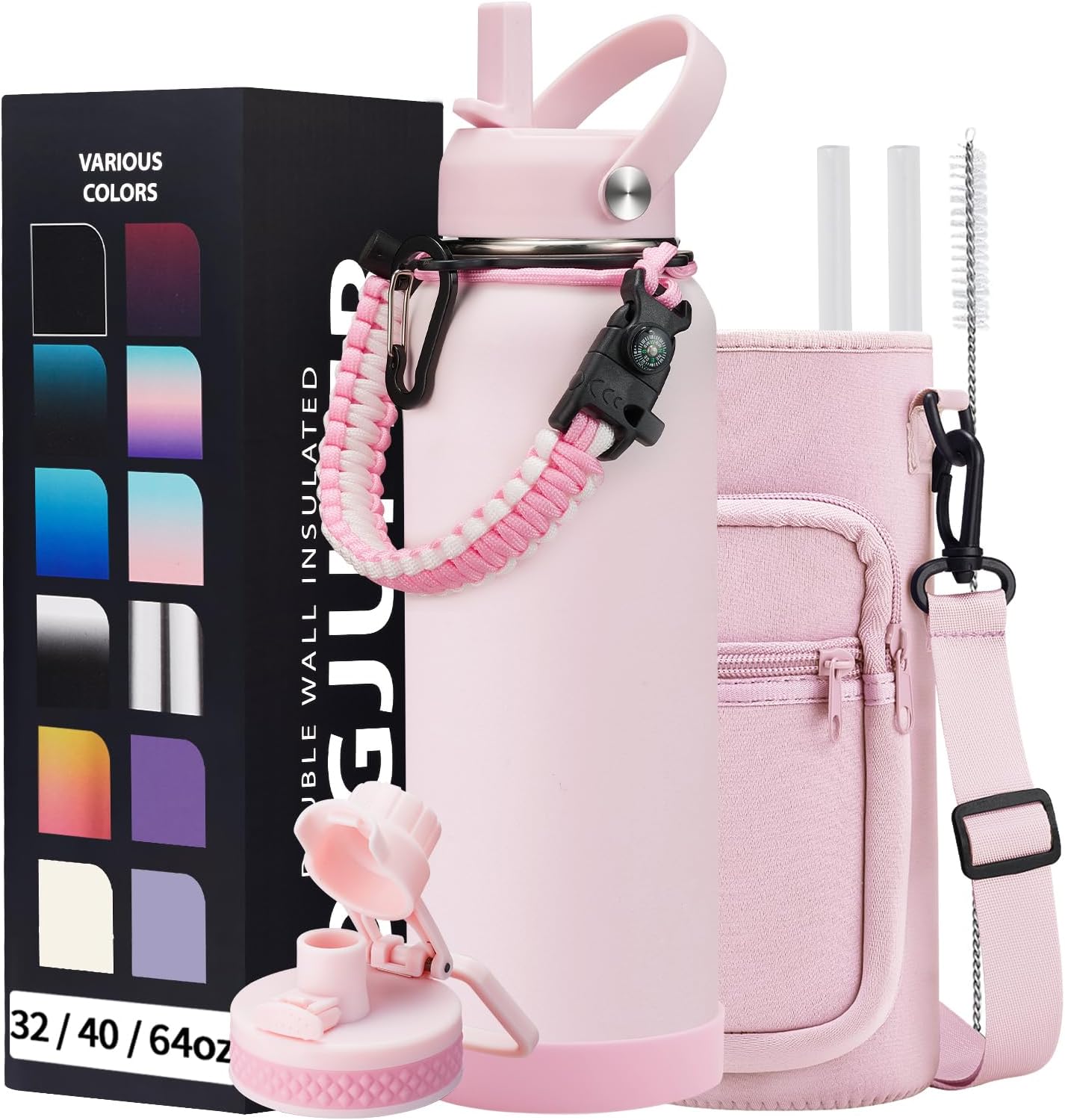 - COMBO—Super Deal: Buy 40oz stainless steel water bottles and get 9 accessories (2 x lids, 1 x survival paracord, 1 x carrying pouch, 1 x shoulder strap, 1 x protective cup mat, 2 x straws, 1 x straw brush). WITH A LIFETIME GUARANTEE, these thermal water bottles are the perfect gift for use at home, work, school, road trips, hiking, sporting events, or just hanging out