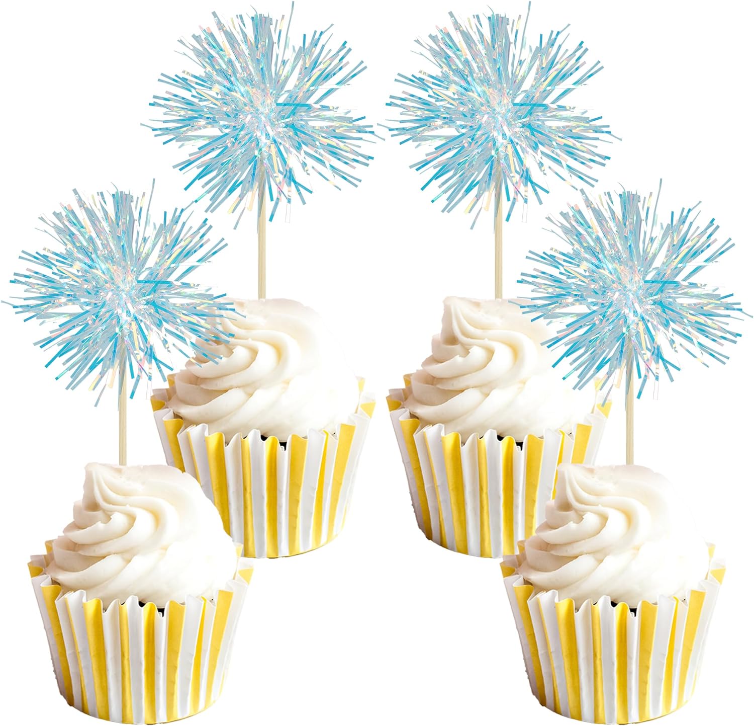 Gyufise 30Pcs Foil Firework Cupcake Toppers Sparkle Tinsel Cake Toppers Tinsel Drink Cake Decoration Cocktail Picks for Birthday Wedding Graduation Party Supplies Laser Blue