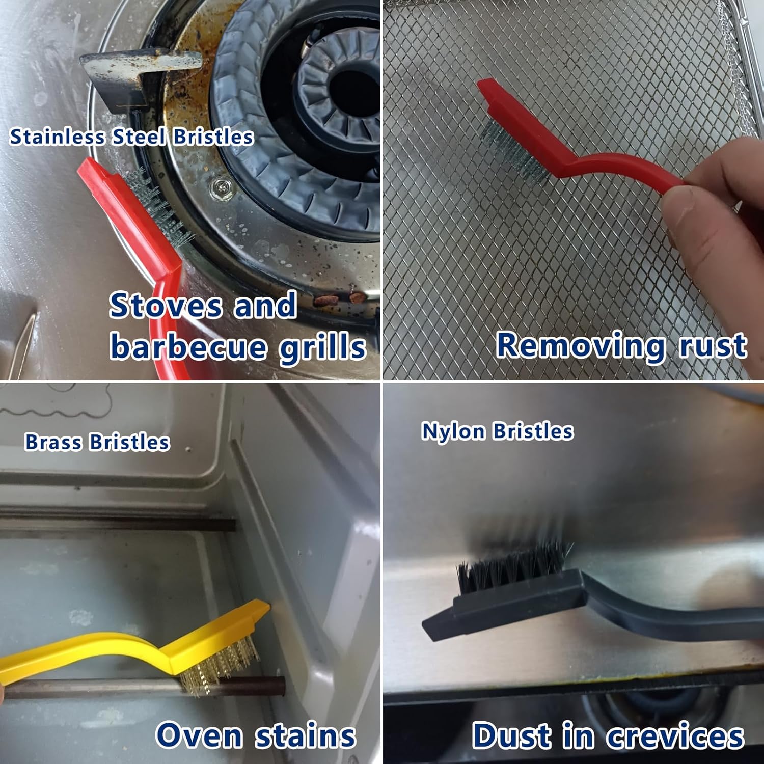 - 【 Three color cleaning brush 】3 different brushes, different materials, providing different cleaning strengths (stainless steel>brass>nylon) to meet various cleaning needs. Stainless steel brushes are perfect for removing rust, grease, and old stains. Brass brushes can effectively solve stubborn stains, gas stoves, and pot bottoms. The nylon brush uses soft bristles, which are very suitable for cleaning dust in small gaps. The brush head adopts a scraper design, effectively removing stubborn stains.