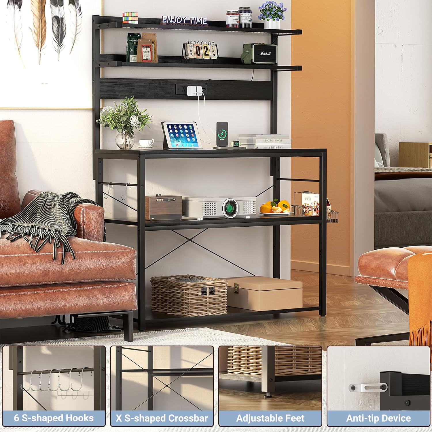Aheaplus Bakers Rack with Power Outlet, Microwave Stand, 5 Tiers Coffee Bar Station with Led Lights, Kitchen Storage Shelf with 6 S-Shaped Hooks, Kitchen Rack Coffee Bar Stand, Black