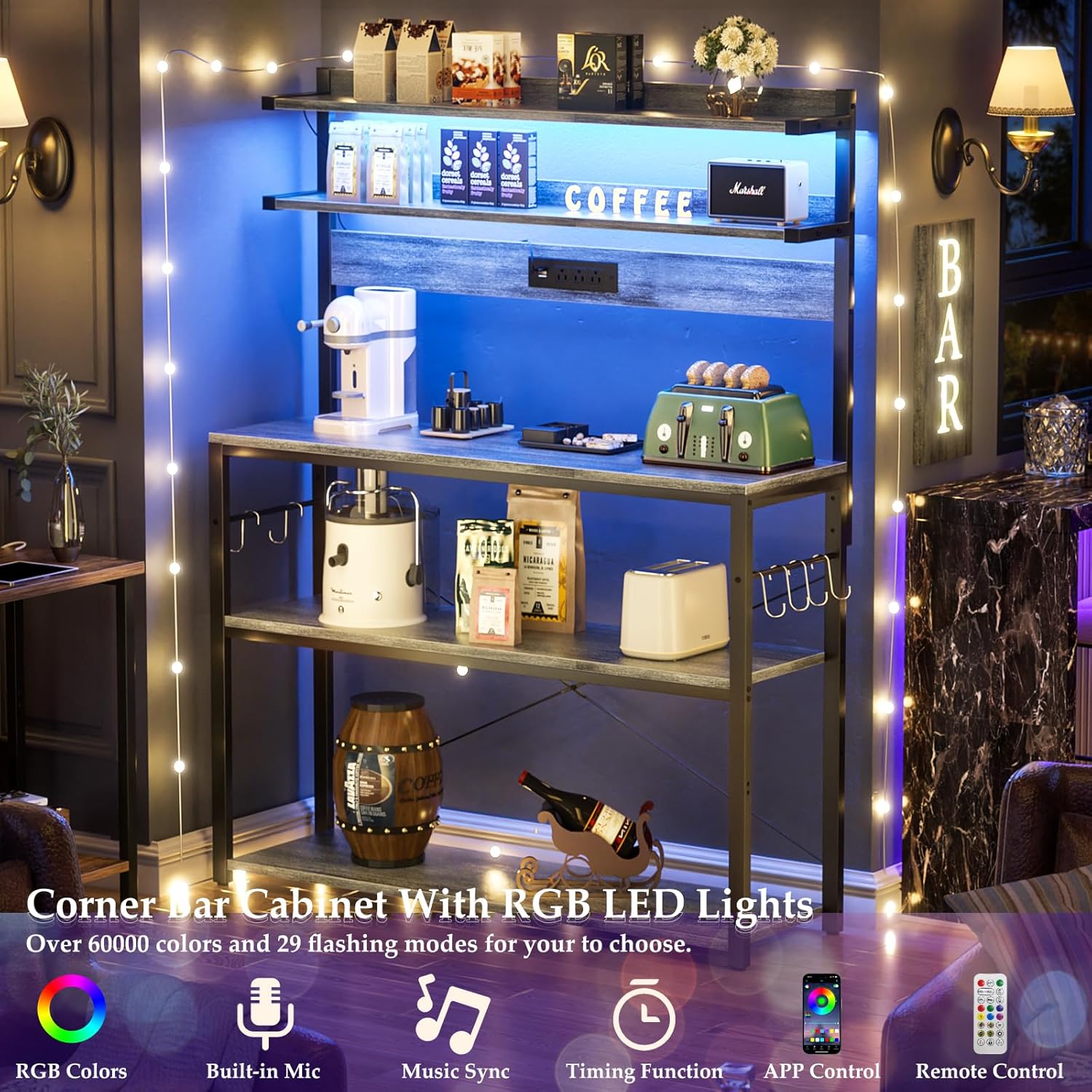 - 【Storage Rack with LED Strip】This coffee bar table features built-in LED lighting can support smart app control and IR control, multiple colors and flashing modes for your to choose. Led lights built-in music sync function can change the lights color with the rhythm of the sound and music, Try to DIY your kitchen, and enjoy the party or festival atmosphere anytime.