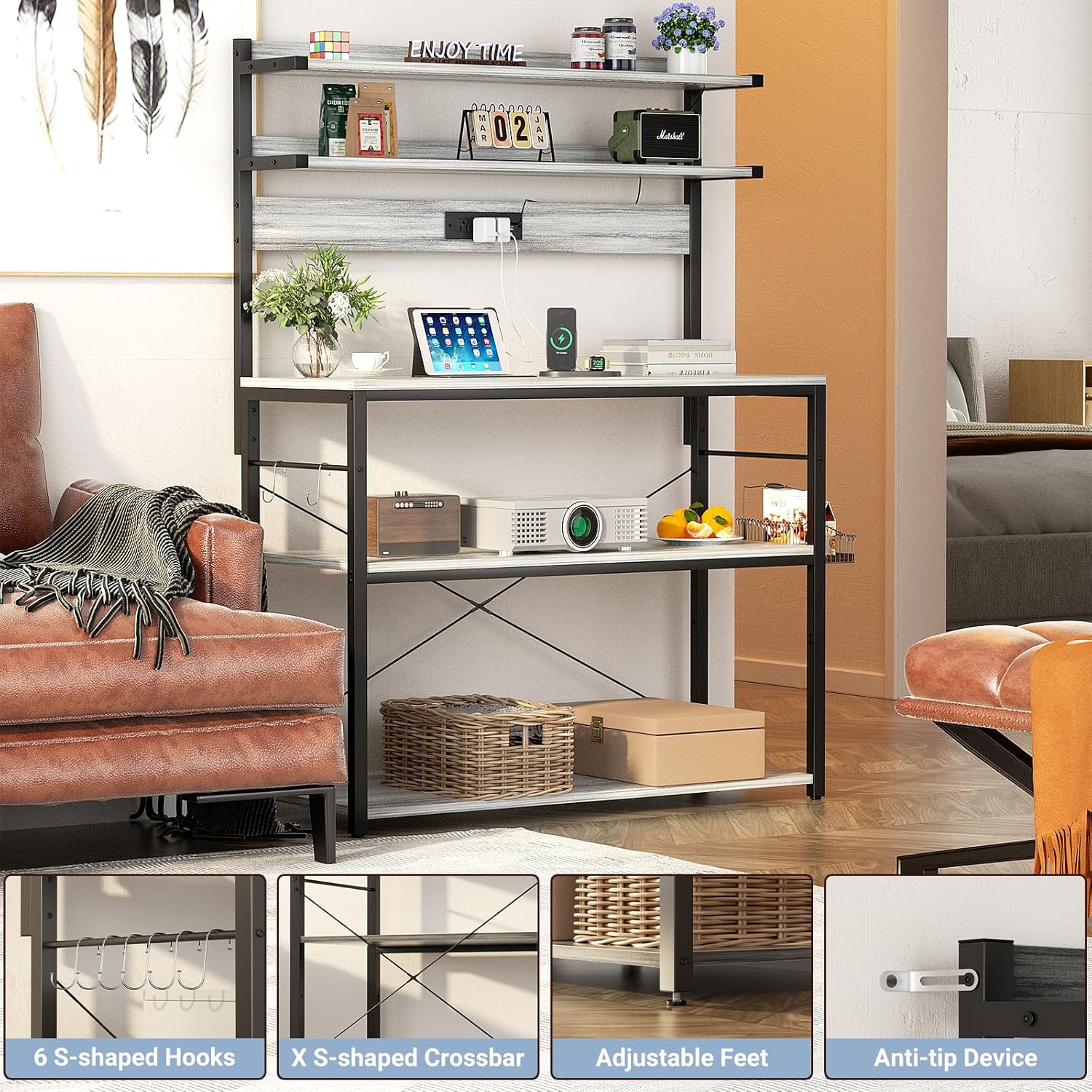 - 【Bakers Rack with Power Outlets】Our kitchen storage shelf includes 3 AC outlets + 2 USB charging ports to provide power for up to 5 devices simultaneously, Easily charge the coffee or bread maker in your kitchen. don't need to move around to find a power source and keep your kitchen tidy and organized. Overall dimensions: 31.5" W *15.7" D *58.1"H