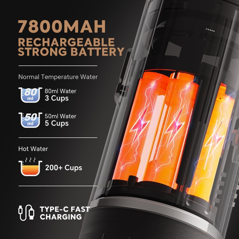 • POWERFUL BATTERY - Portable Electric Espresso Maker: 2-hour full charge (USB-C + fast charger included). Brew 200+ cups with hot water; 3-5 with cold.