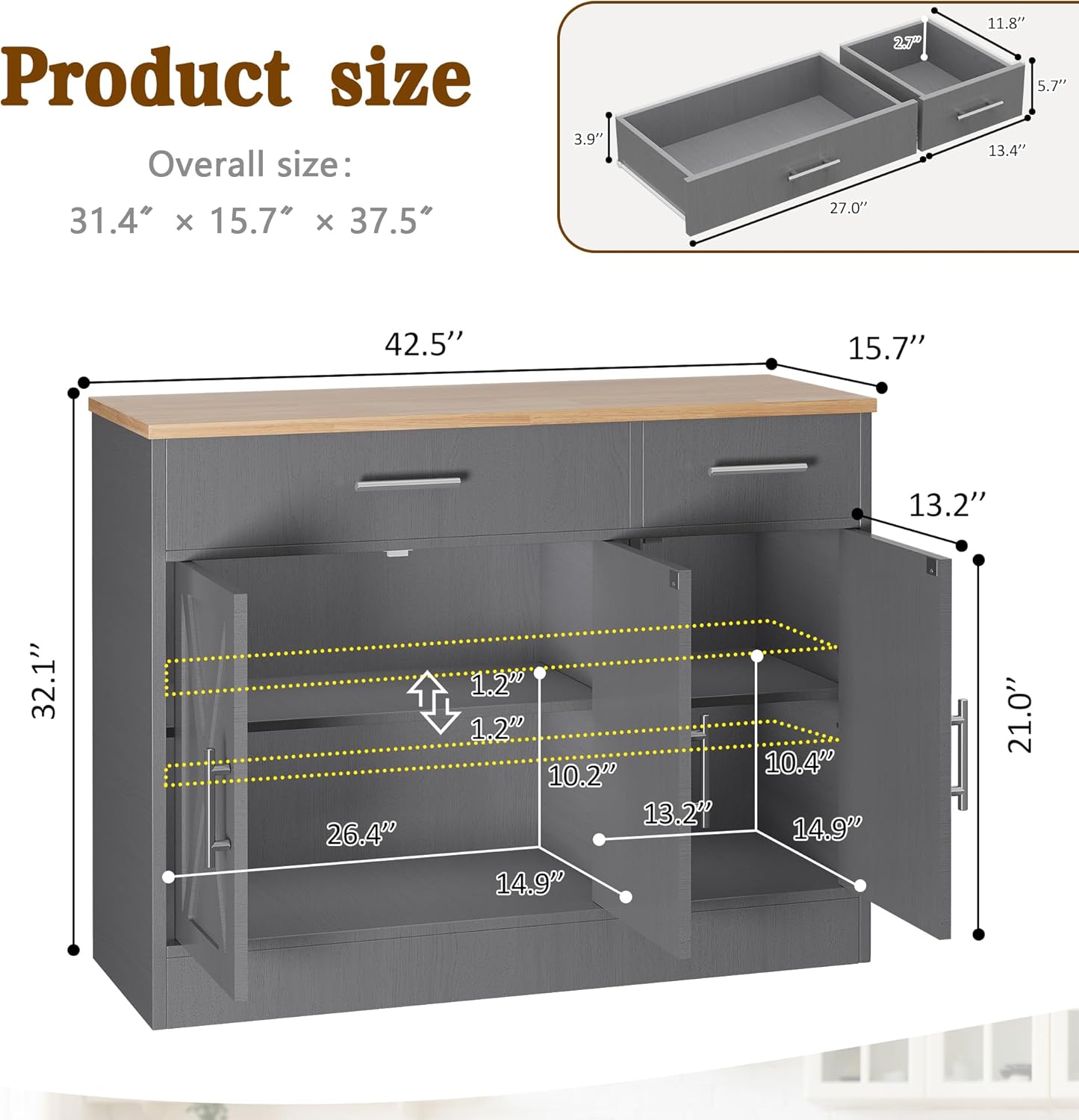 - PRODUCT DIMENSIONS INFO: This buffet cabinet measures 42.5 "W x 15.7" D x 32.1 "H. Large drawer Size: 27" W x 11.8 "D x 3.9" H. And the spacious tabletop can place coffee makers, microwave ovens and various decorations.