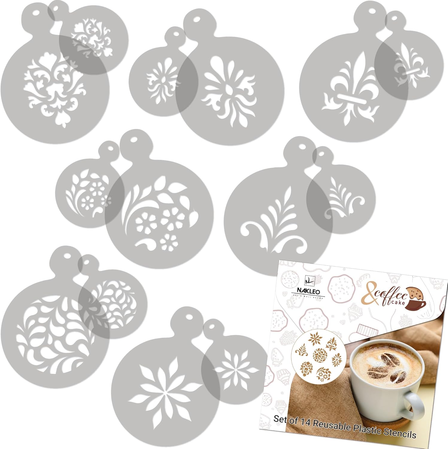 NAKLEO Coffee Stencils and Cookies Decoration 14Pcs 2.8”x2.8” and 4.3”x4.3”, Reusable Plastic Baking Templates, Ornament Pattern Decor, Barista DIY Art Craft, Capuccino Latte Chocolate Cake Biscuit