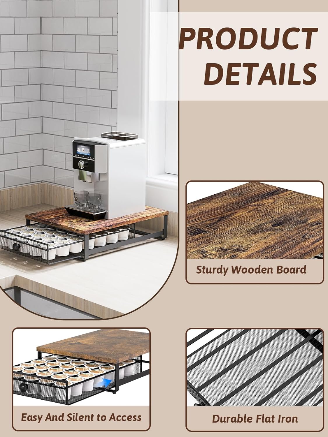 - Large Capacity with Anti-Fall Design: This K-Cup Pod Organizer Holds up to 35 K-Cup Pods and Features an anti-fall Retainer Inside the Drawer to Keep Pods Securely in Place. Built-in Silent Pads Ensure Smooth and Quiet Sliding for a Better User Experience.