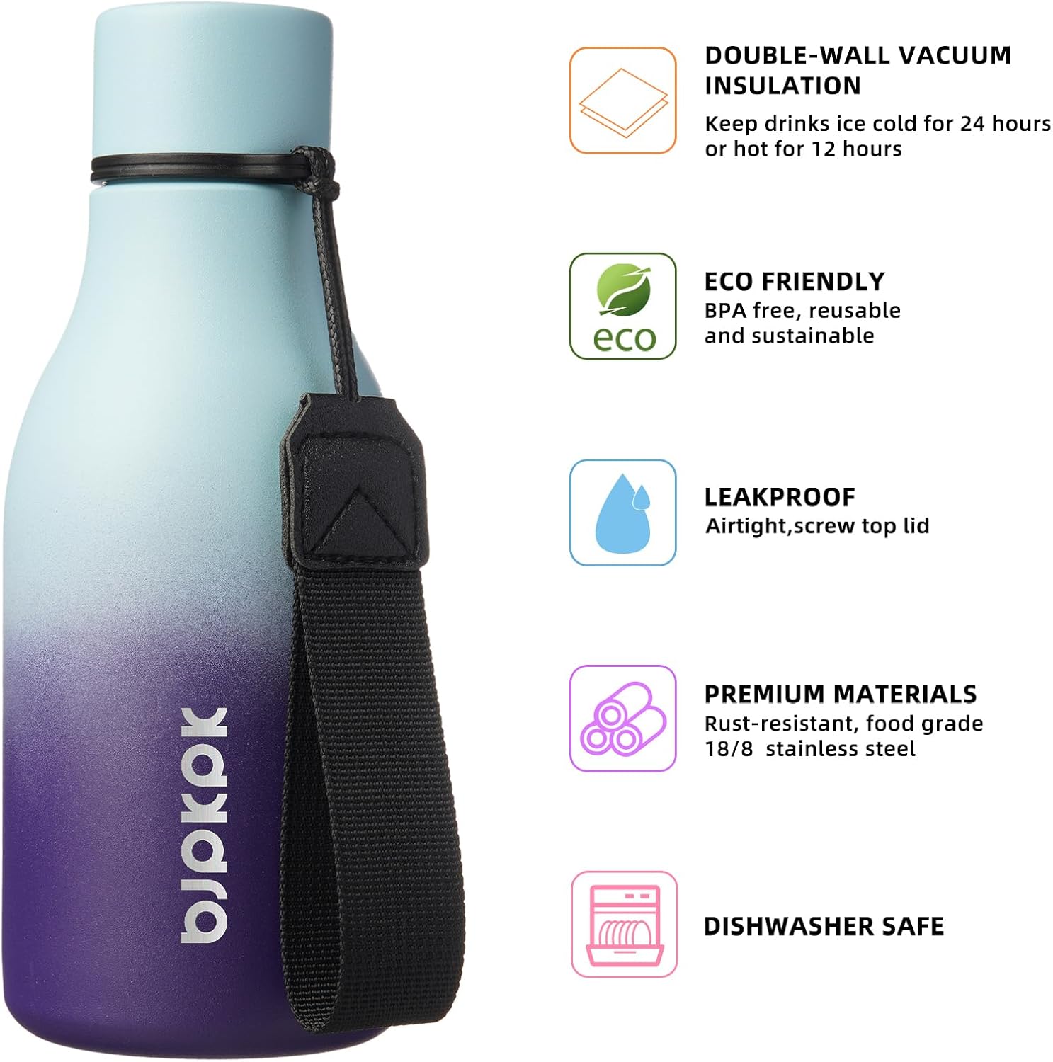 - Stylish & Durable: With European style design, durable and fashionable powder coating, our sports water bottle is not only functional, but also stylish and durable. Whether you're at the office or out and about, this thermos bottle is the perfect accessory to complement any outfit